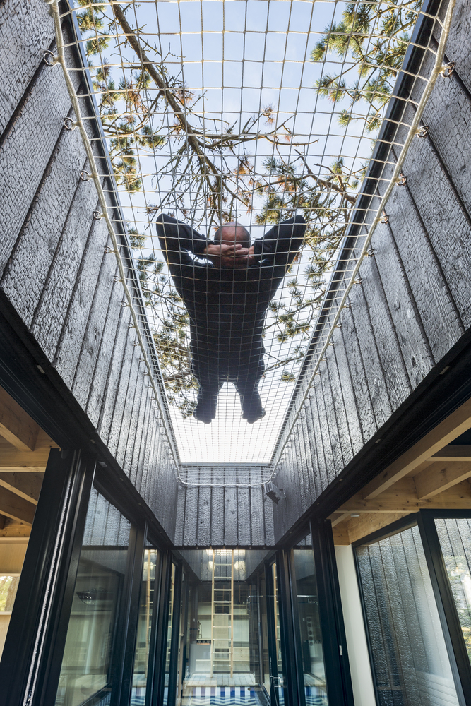 Köy evinin geniş pencerelerin bulunduğu dış cepheleri kömürleştirilmiş ahşap kaplanmıştır. Ağaç kesmemek için oluşturulan avlular aynı zamanda orman manzarasının evin içine girmesini sağlıyor.