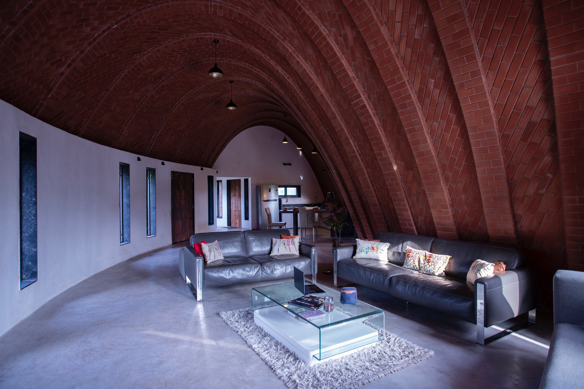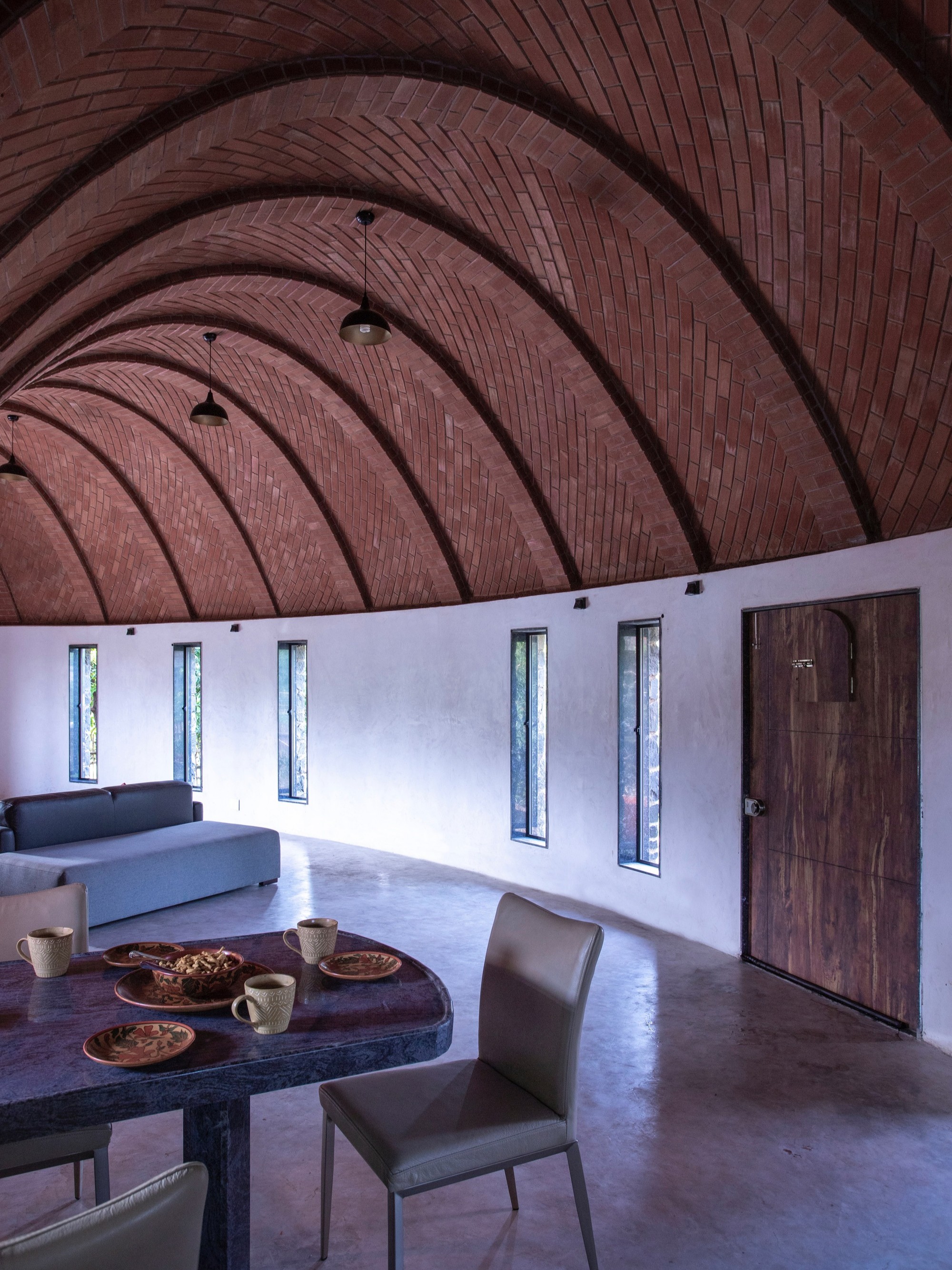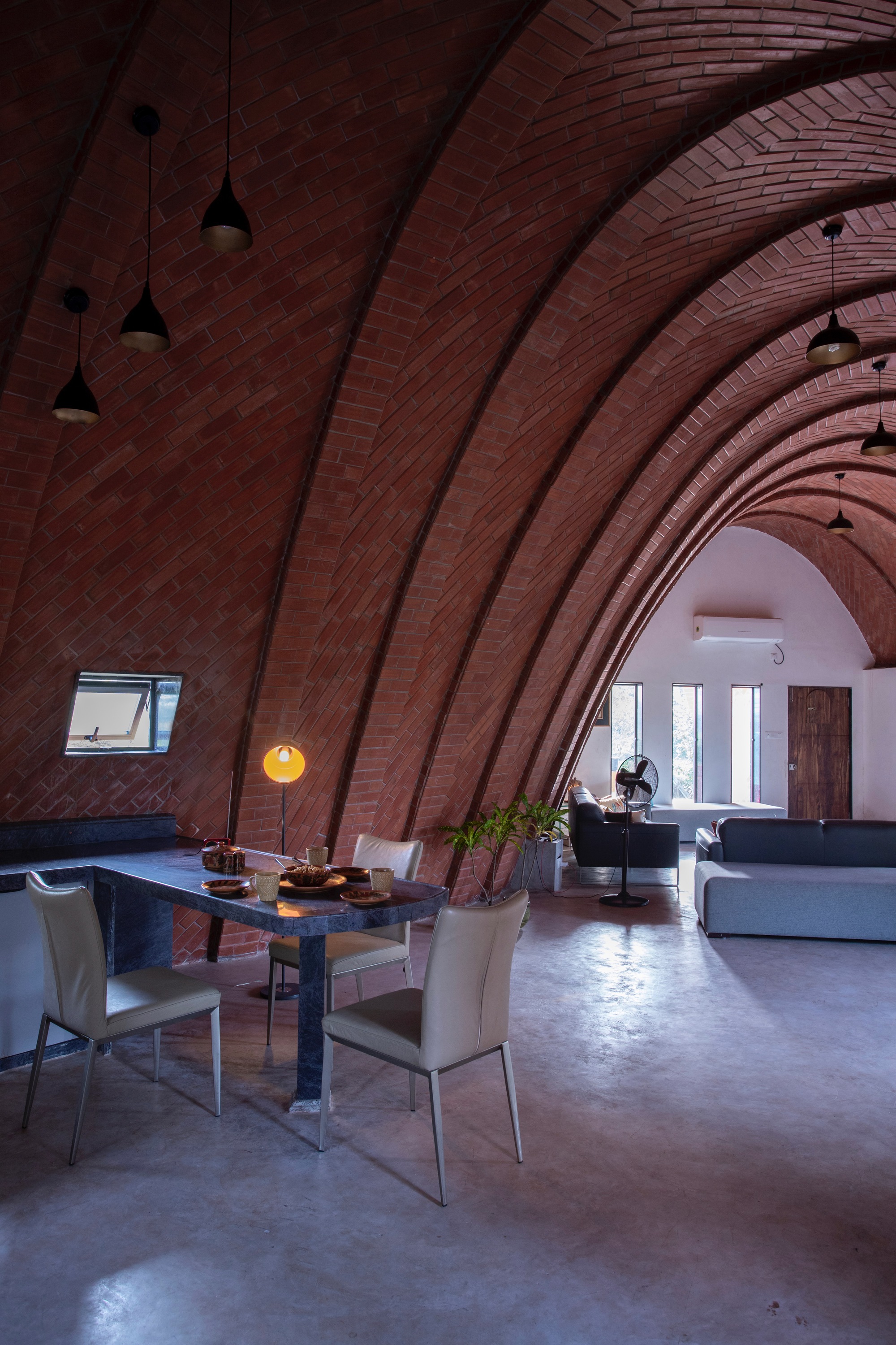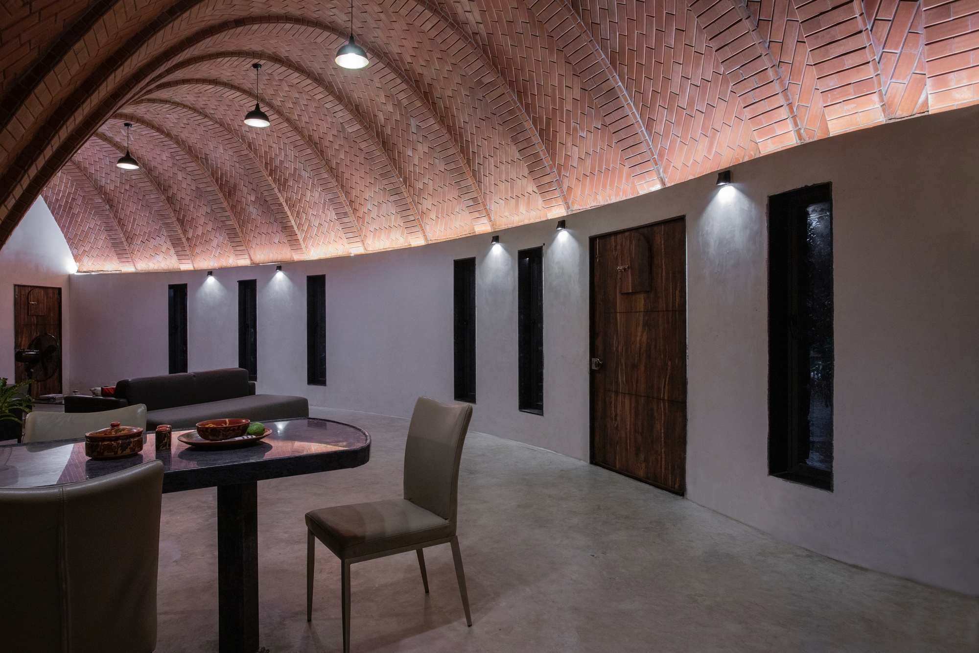 Ağaçların gölgesindeki bina, taşın sağlamlığını ve tonozun zarafetini buluşturuyor. Tonozlu ev, arazideki mango, chikoo ve jamun ağaçları korunarak onların etrafında kıvrımlı bir formda şekillendirildi.