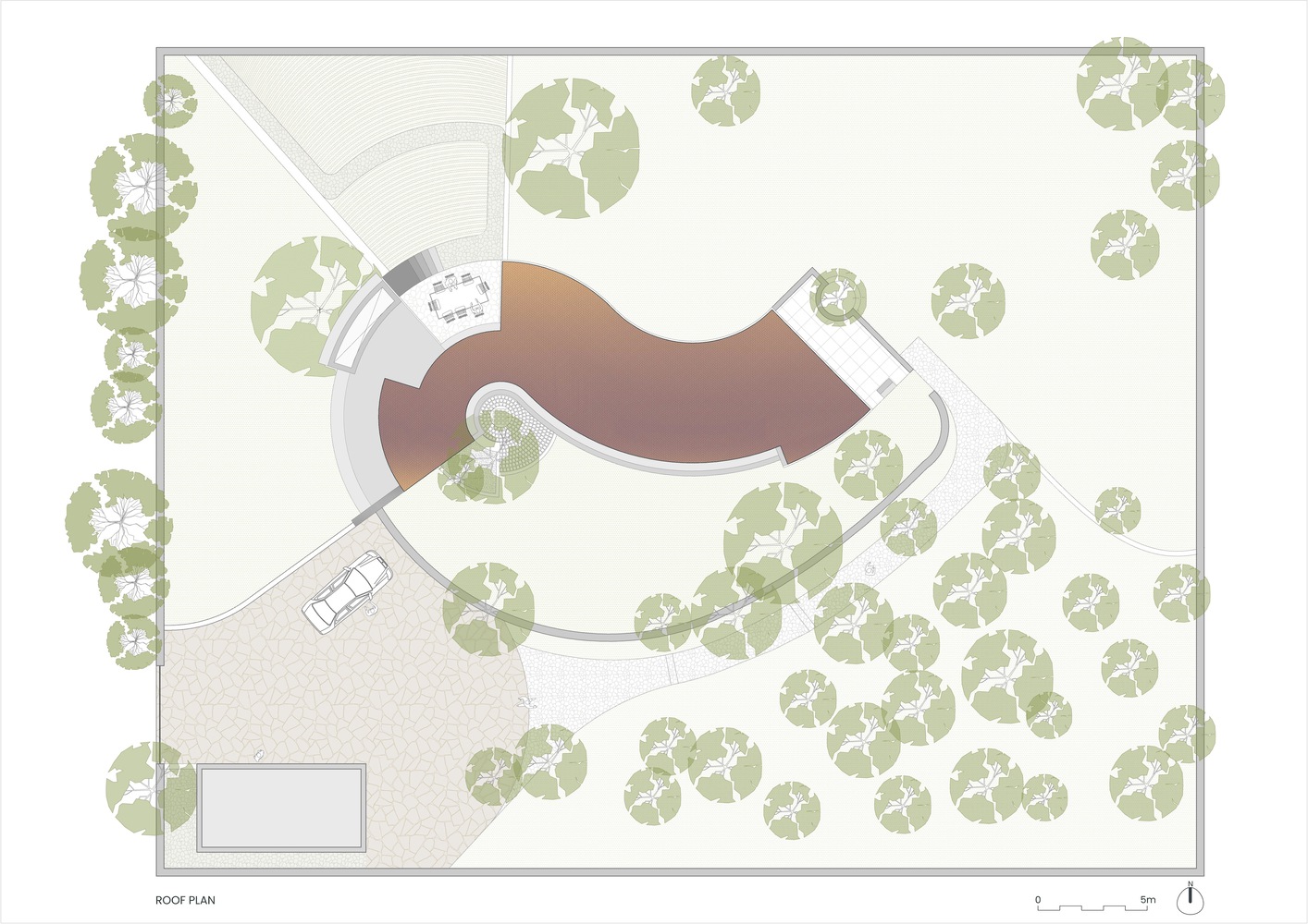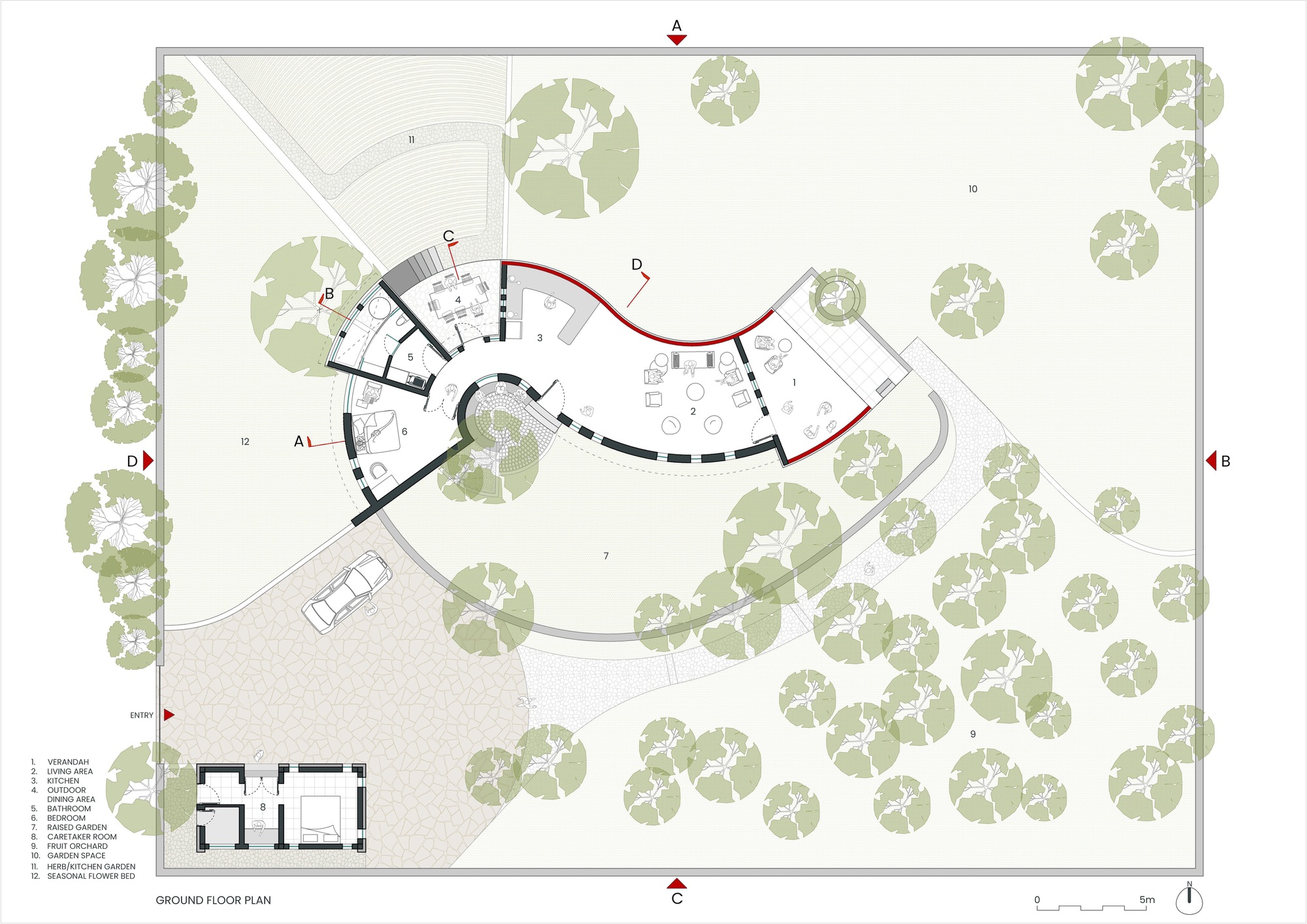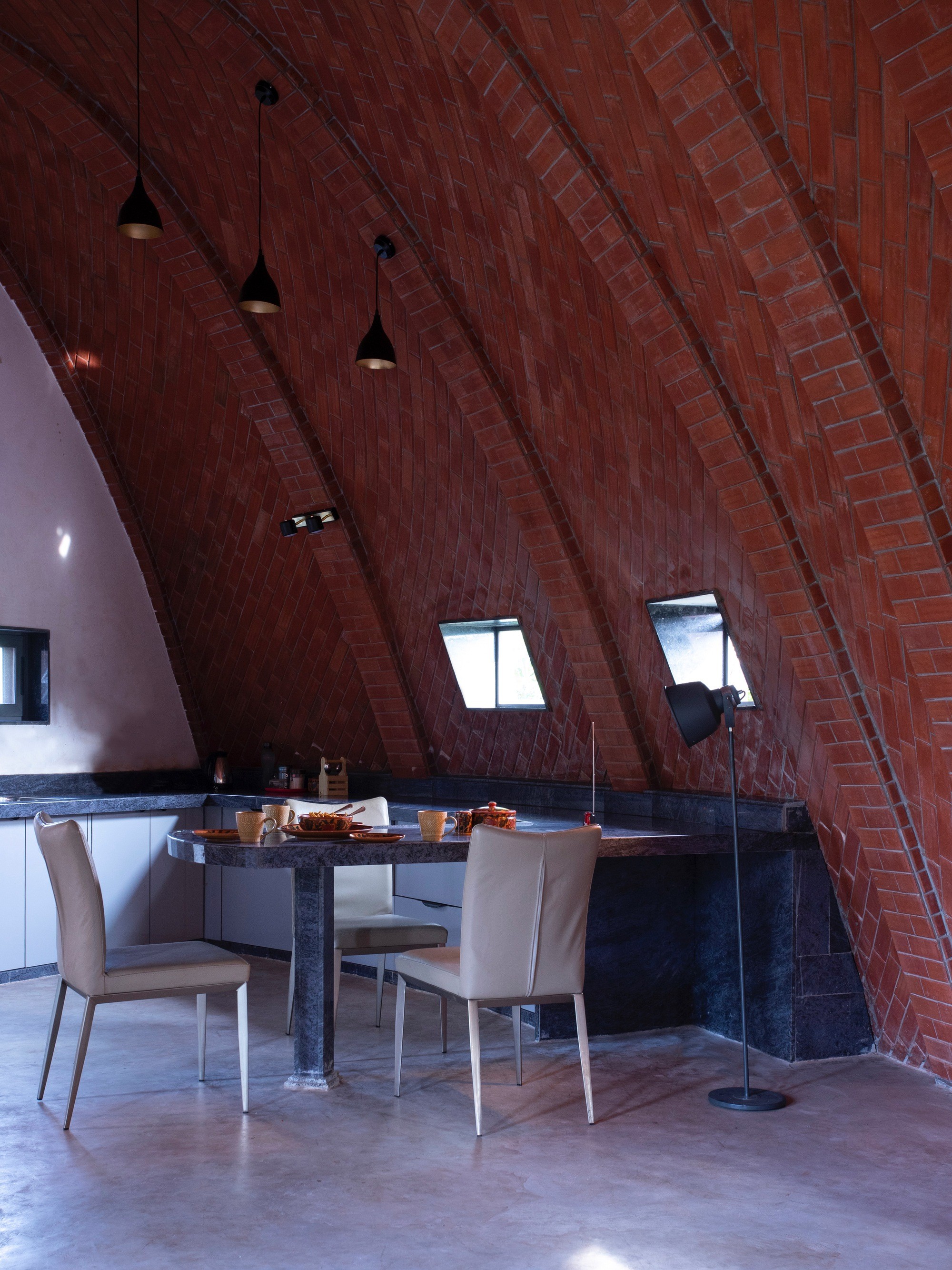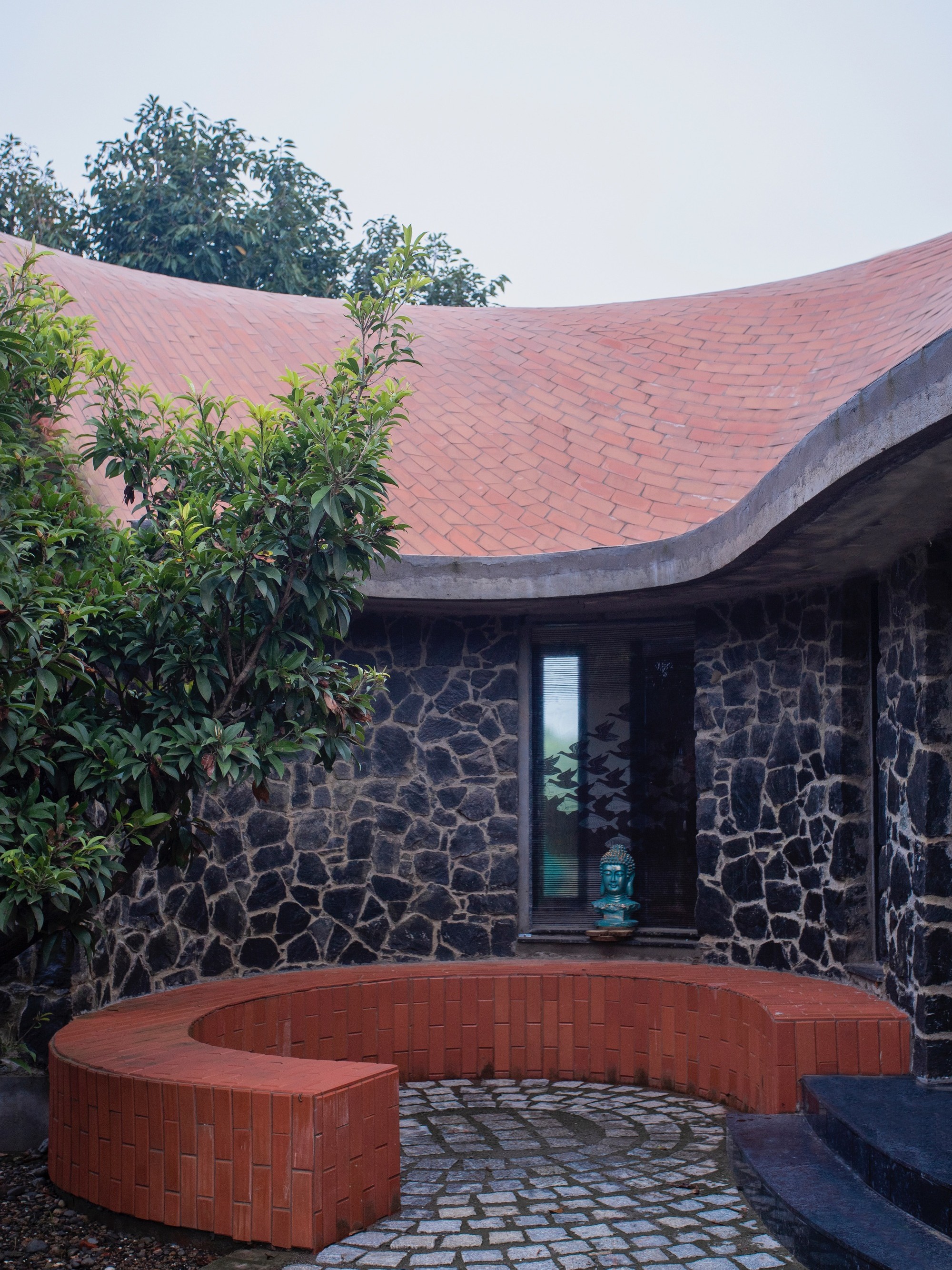 Ağaçların gölgesindeki bina, taşın sağlamlığını ve tonozun zarafetini buluşturuyor. Tonozlu ev, arazideki mango, chikoo ve jamun ağaçları korunarak onların etrafında kıvrımlı bir formda şekillendirildi.