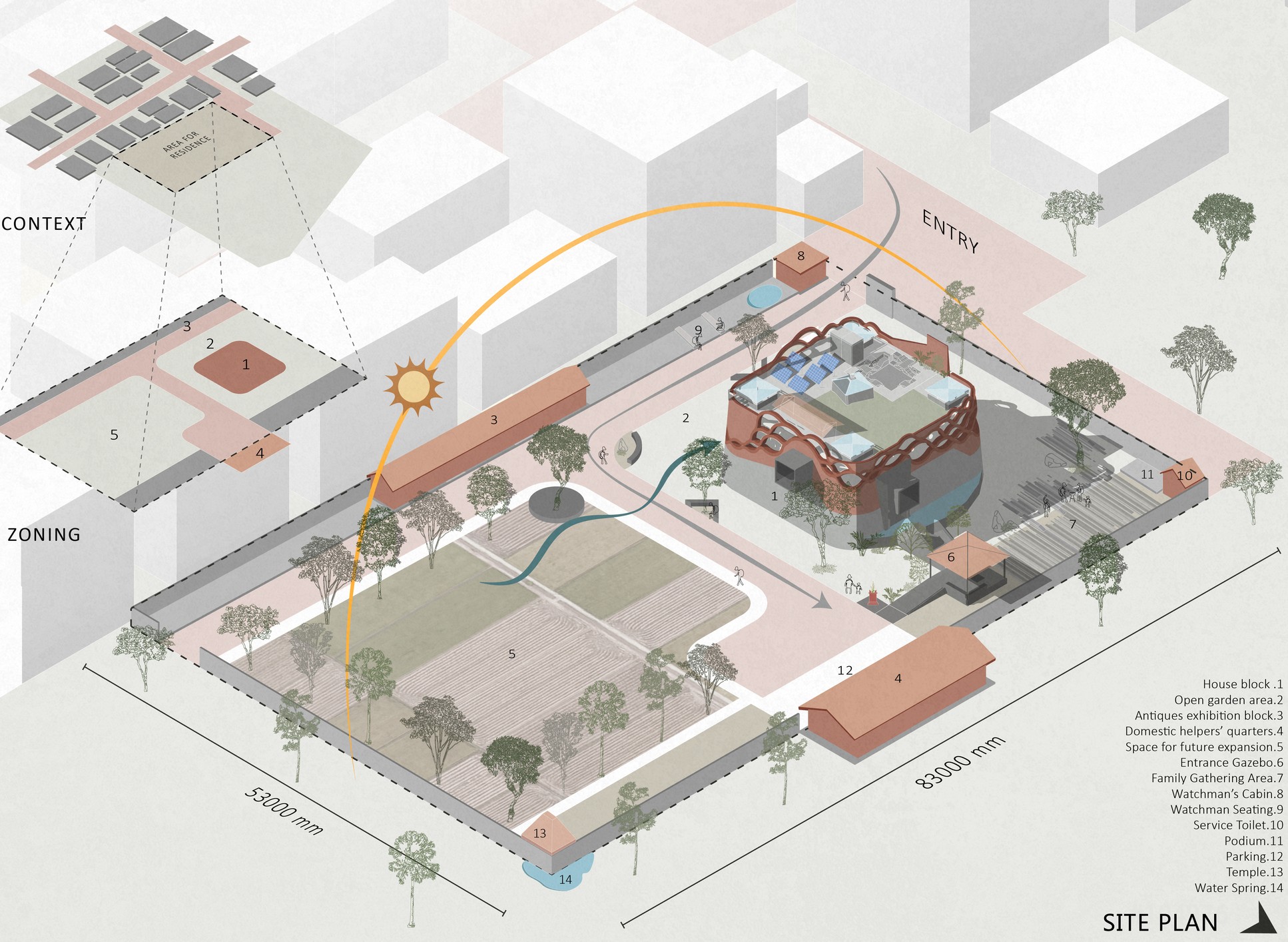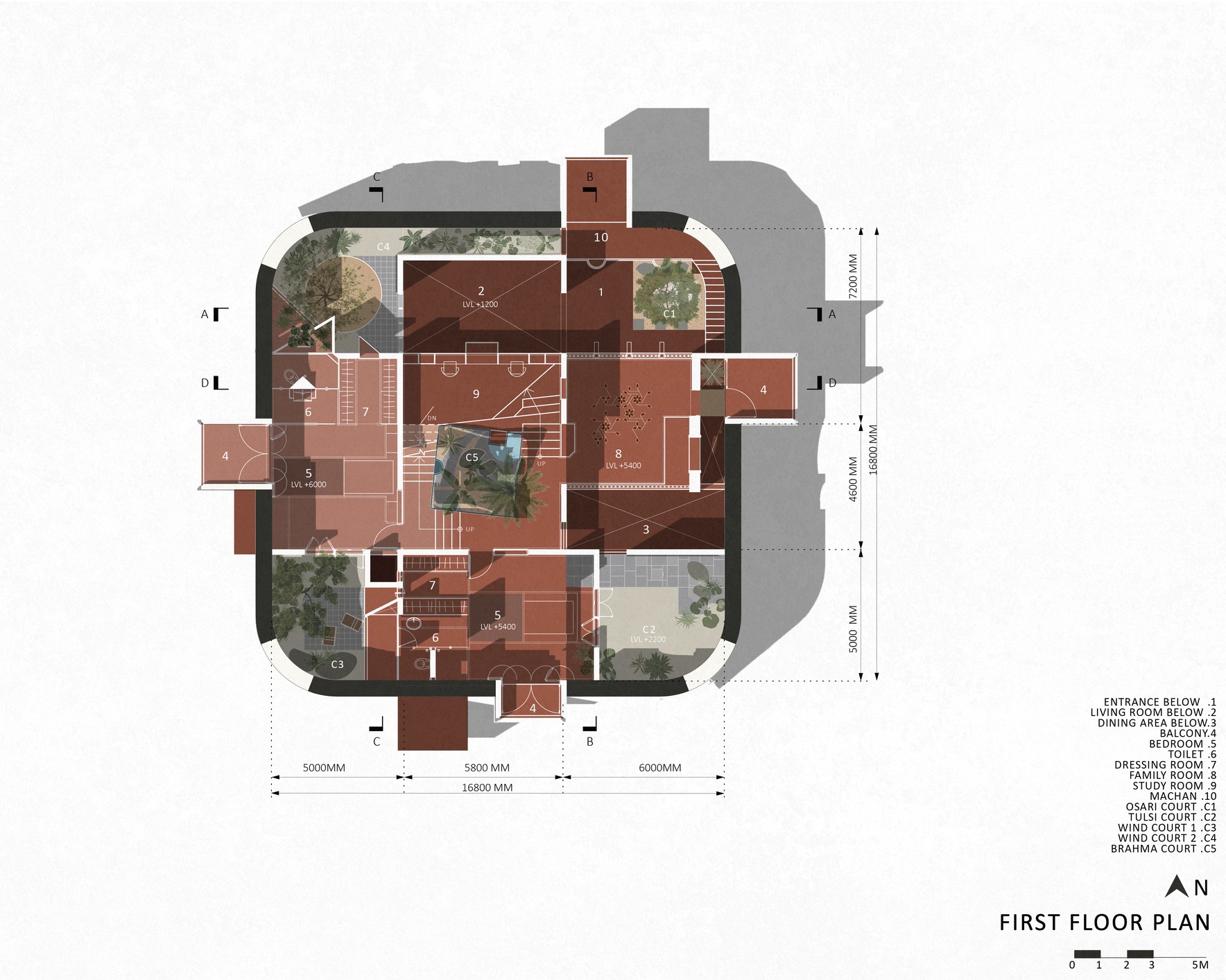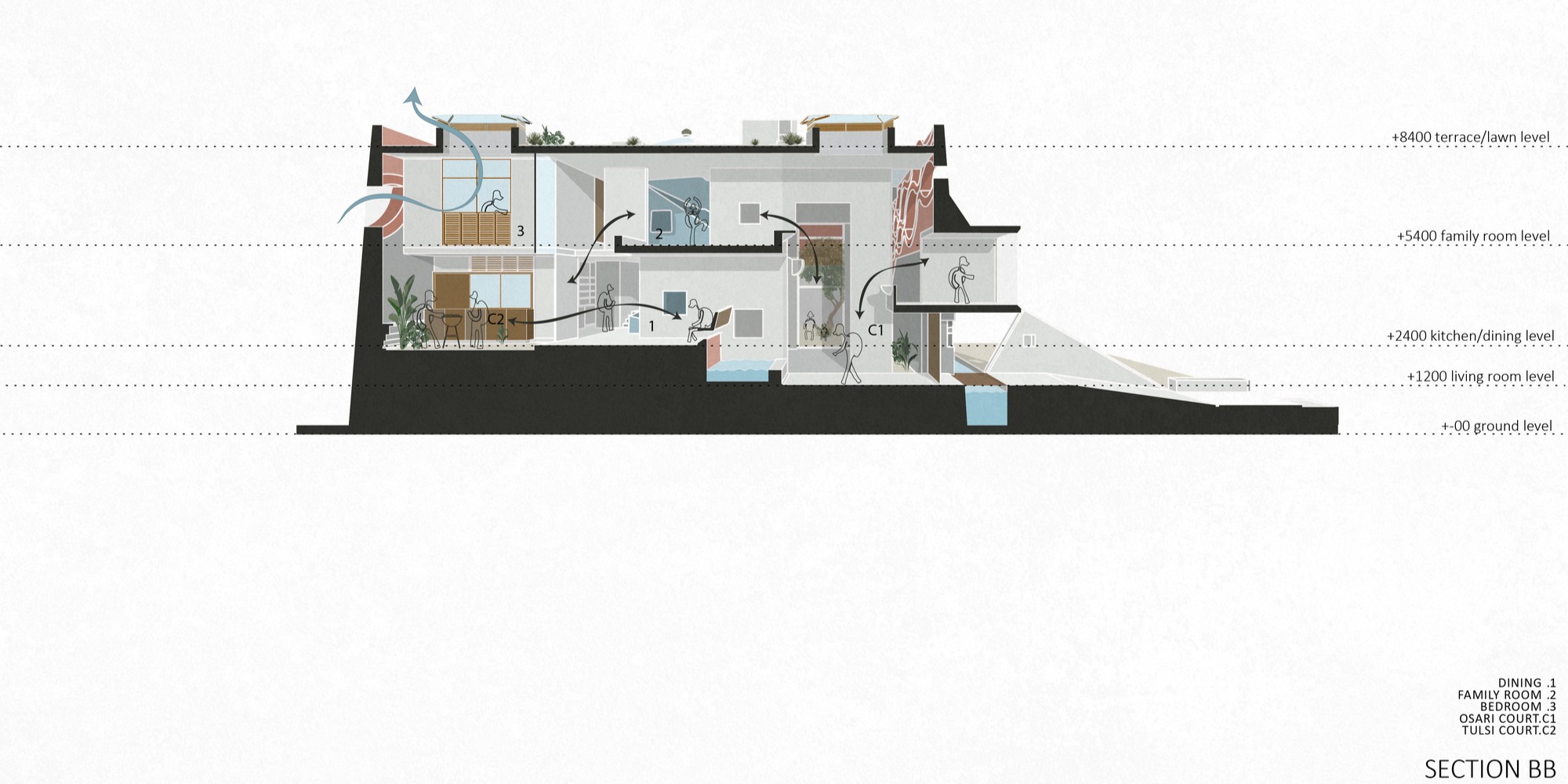 Tasarımın çıkış noktası, bölgesel bir konut tipi olan “Gadi”dir. Dışa kapalı, kalın duvarlarla çevrili bu geleneksel tipoloji; iç avlular, balkonlar ve ortak alanlarla zenginleşir. Bu anlayış, modern ihtiyaçlar ve güncel yapım sistemleriyle yeniden yorumlanarak zamansız bir mimari kimlik kazanır. Mekânsal organizasyon, geleneksel mimarideki “Khand” modülüne dayanır. Bu modüller haç plan düzeninde bir araya getirilmiş, köşelerde gökyüzüne açık nefes alanları oluşturulmuş ve mekânlar düşeyde basamaklarla birbirine bağlanmıştır.