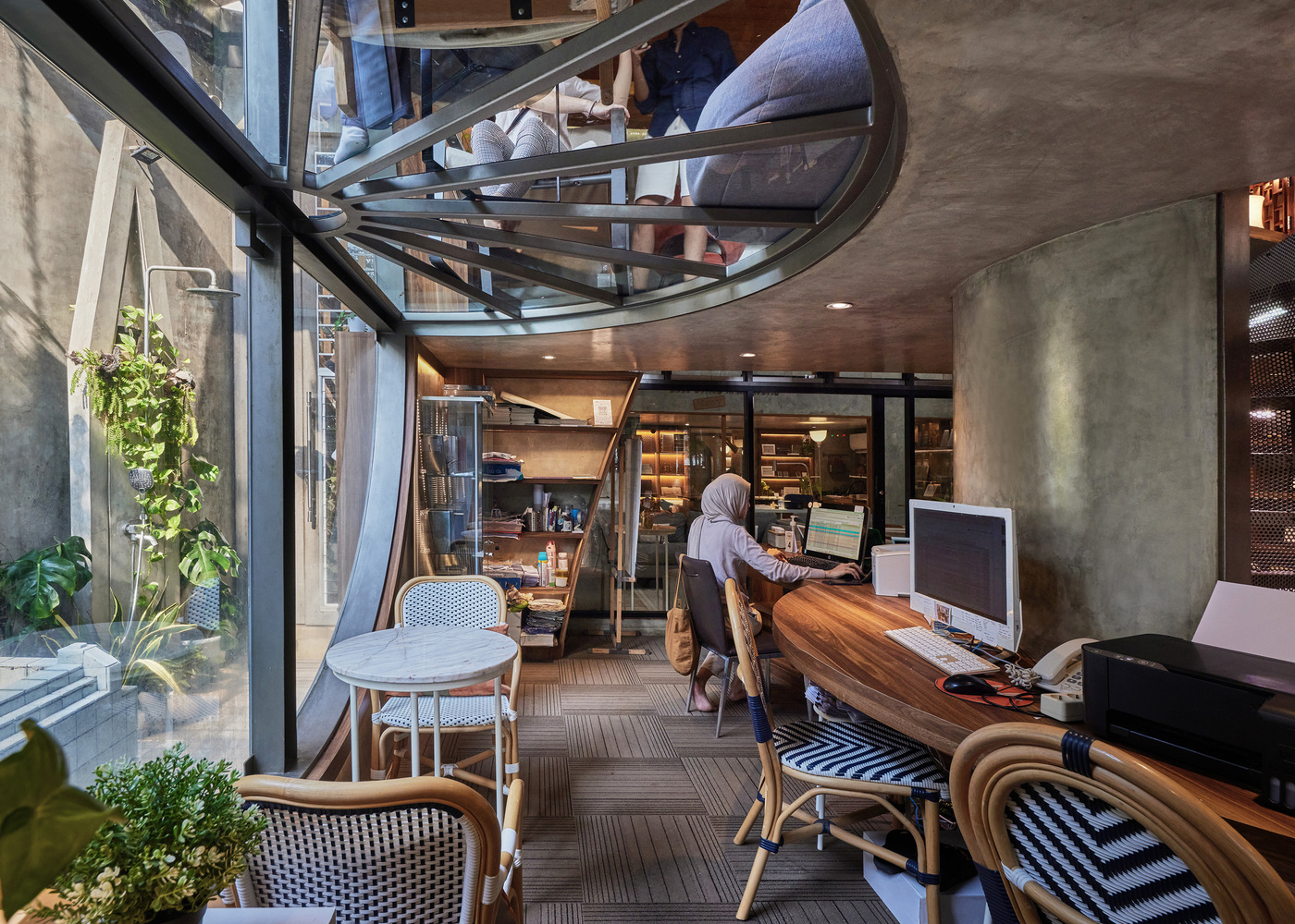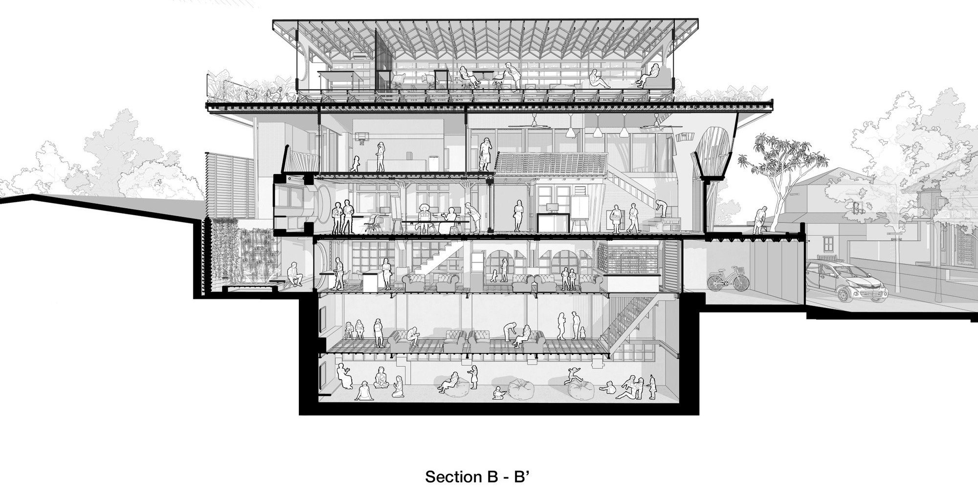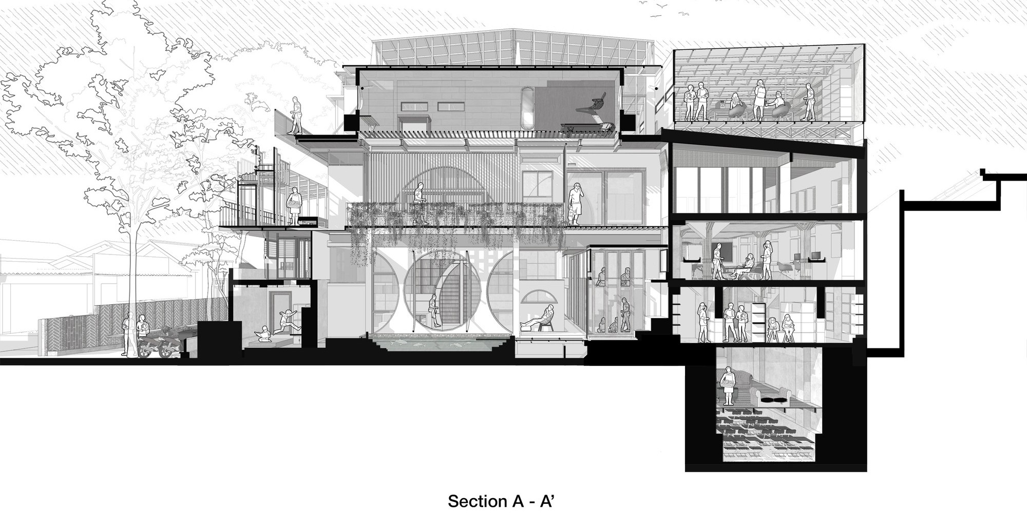 İki farklı mahallenin kesişiminde yükselen yapı herkese açık bir yaşam alanı olarak kurgulanmıştır. Komşuluk, eğitim ve doğanın kesiştiği mimarlık ofisi sosyal açıdan farklı toplulukları birbirine bağlayan bir rol üstleniyor.
