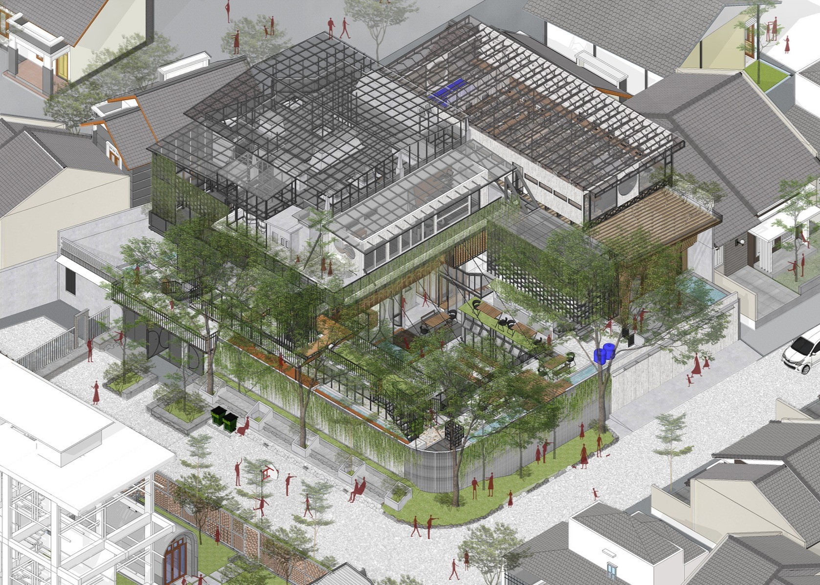 Mimari dil, köy yaşamının dar sokaklarını ve sürprizli geçişlerini hatırlatıyor. Bir yandan bambu, ahşap, geri dönüştürülmüş kiremit gibi yerel ve geleneksel malzemeler, diğer yandan beton, cam ve çelik gibi modern malzemeler bir arada kullanılıyor. Böylece yapı, çevresine uyum sağlayan bir “bukalemun” gibi davranıyor.