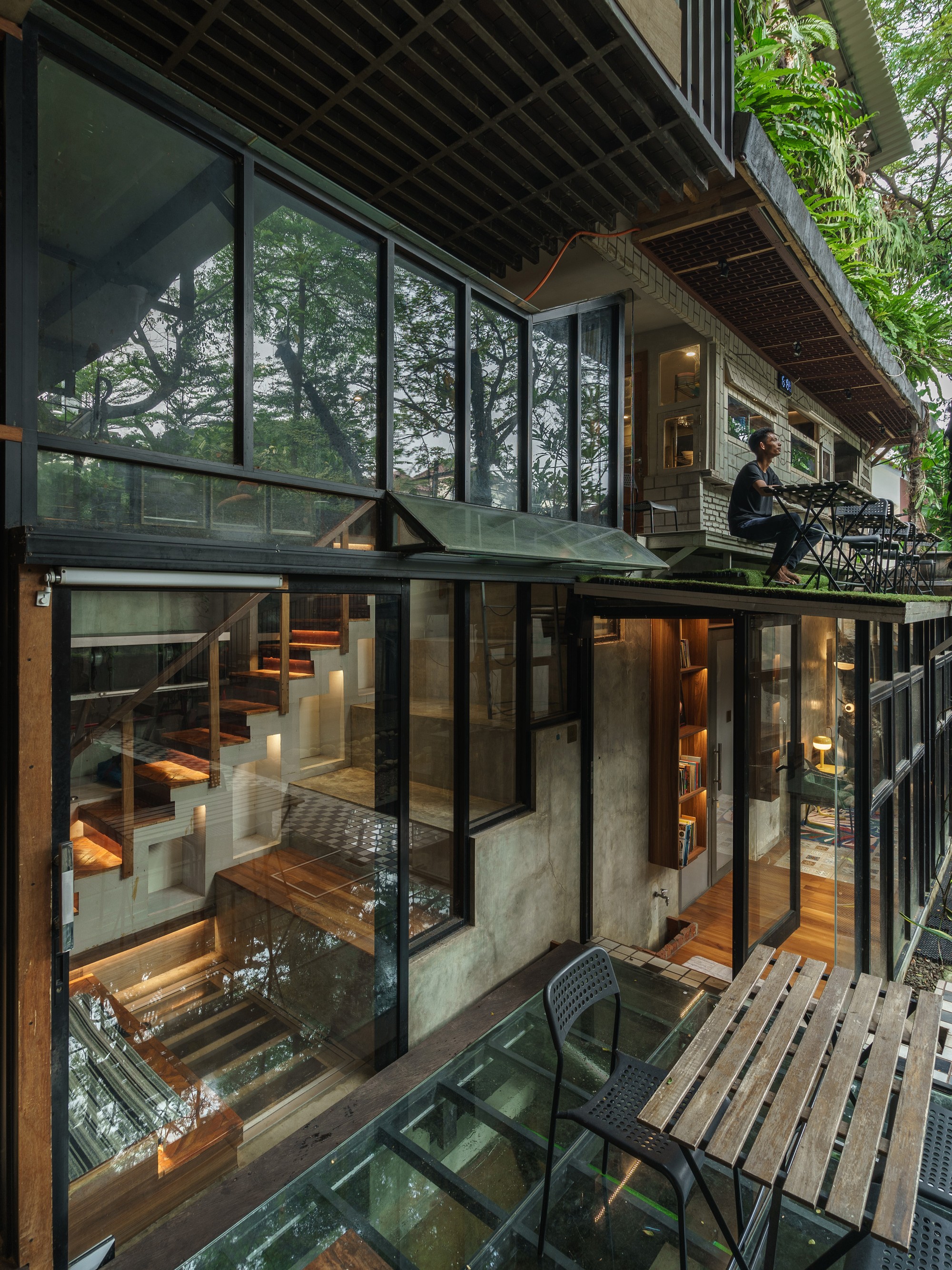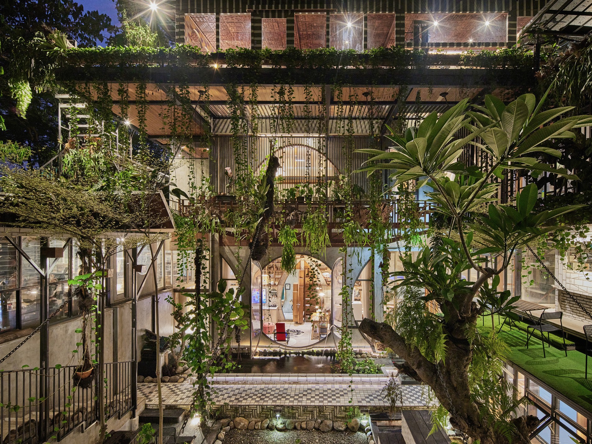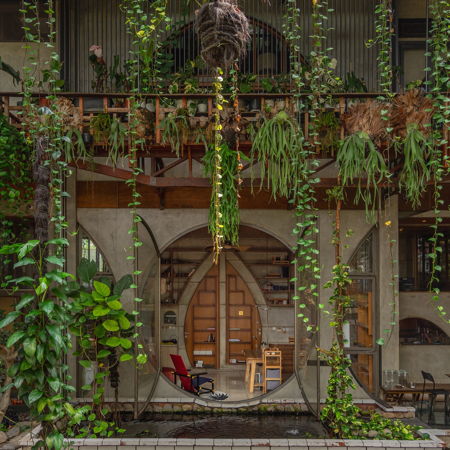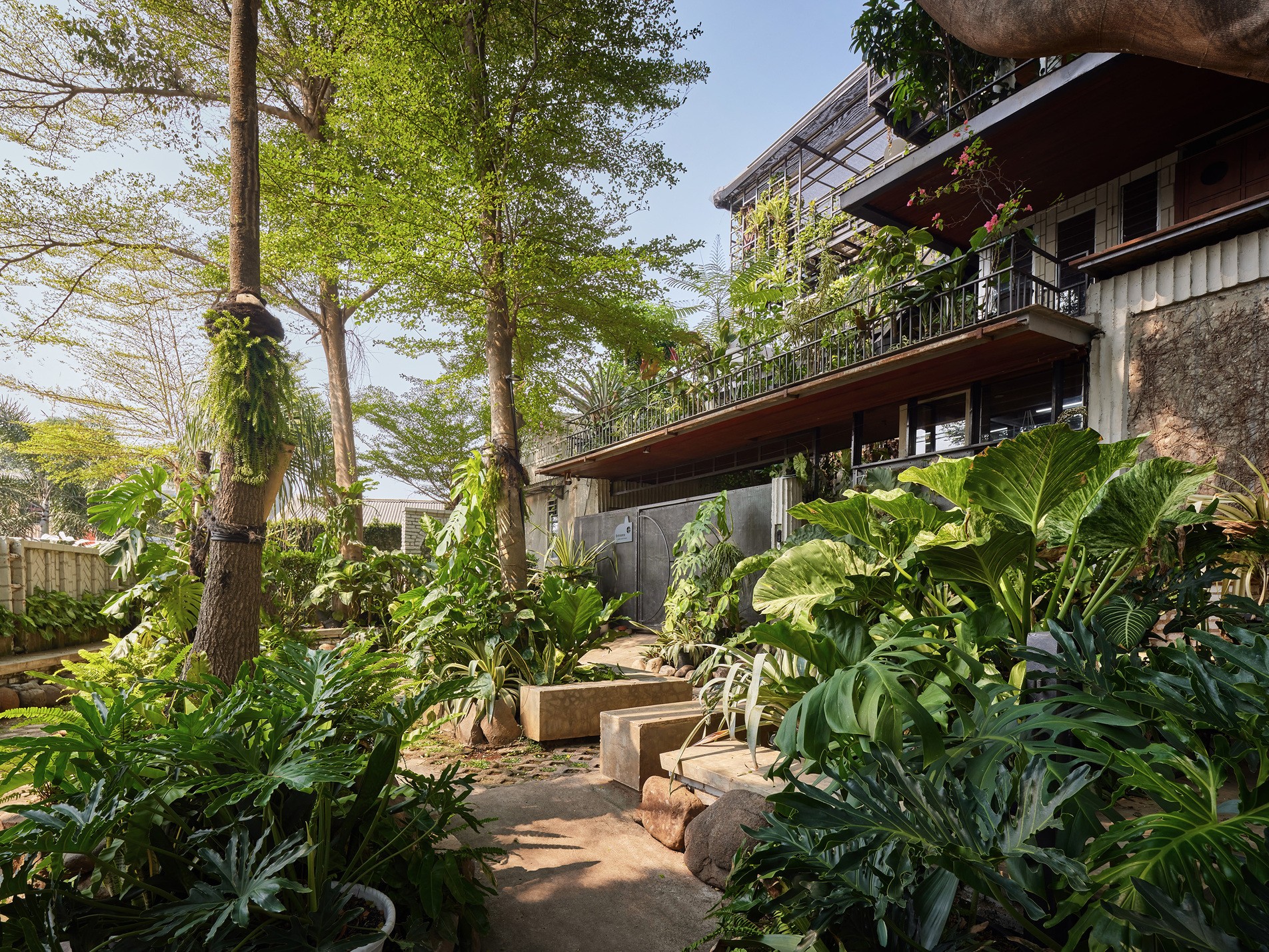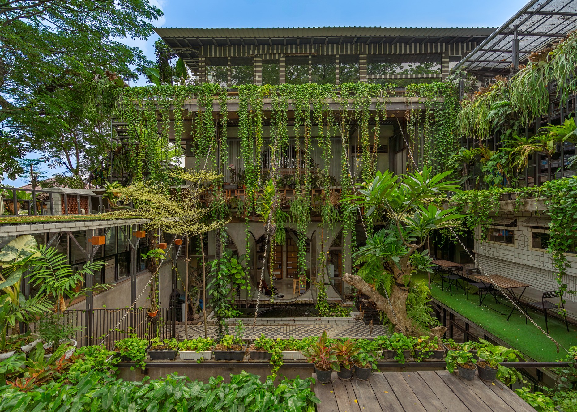 Yaşam alanları da çok yönlü. Aile odaları, öğrenciler için yatakhaneler, sanat ve spor odaları bir arada. Uzun bir koridor olan Benteng Alanı, genç tasarımcıların paylaştığı bir ortak çalışma mekânına dönüşmüş. Doğu tarafındaki bambu fuaye ise yemeklerin ve sohbetlerin yapıldığı samimi bir alan. En üstteki Sky Office, orkide bahçeleri ve Jakarta manzarasıyla adeta yapının kalbi gibi.