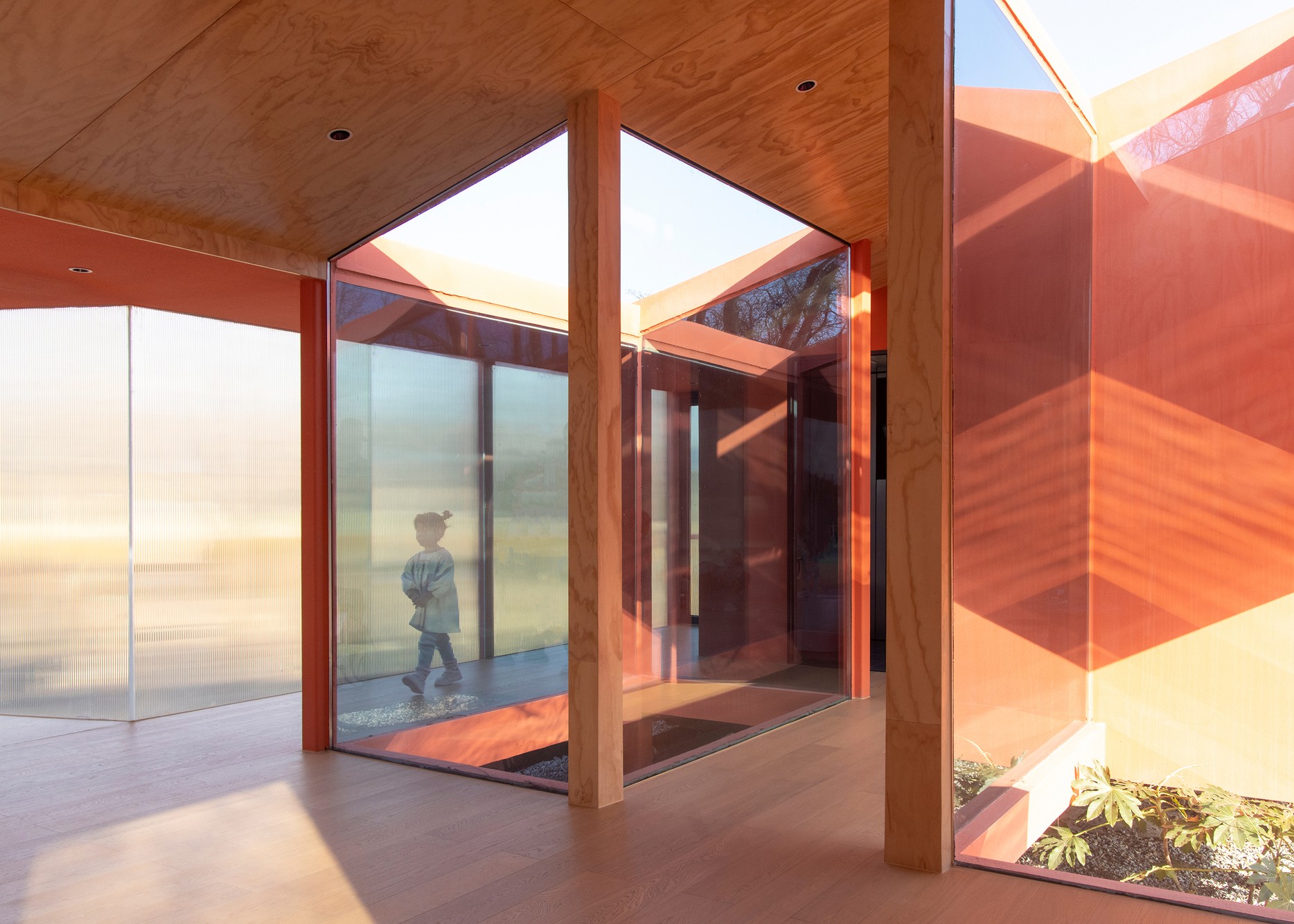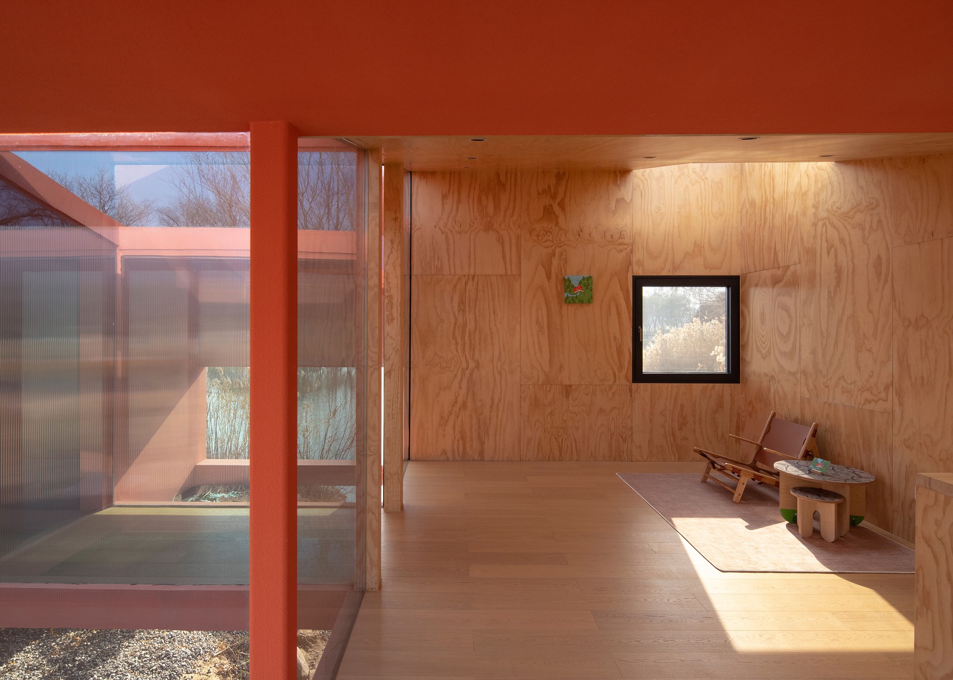 Dar, saydam bir köprüden nehir kıyısına ulaşıp, ahşapla çevrili bir ada evine adım atıyorsunuz. Yarı saydam yüzeyler dış manzarayı bulanıklaştırırken, çerçevelenmiş açıklıklar doğayı iç mekâna taşıyor. İki avlu ve geniş bir ışıklık yaşam alanının içinde bir peyzaj yaratıyor.