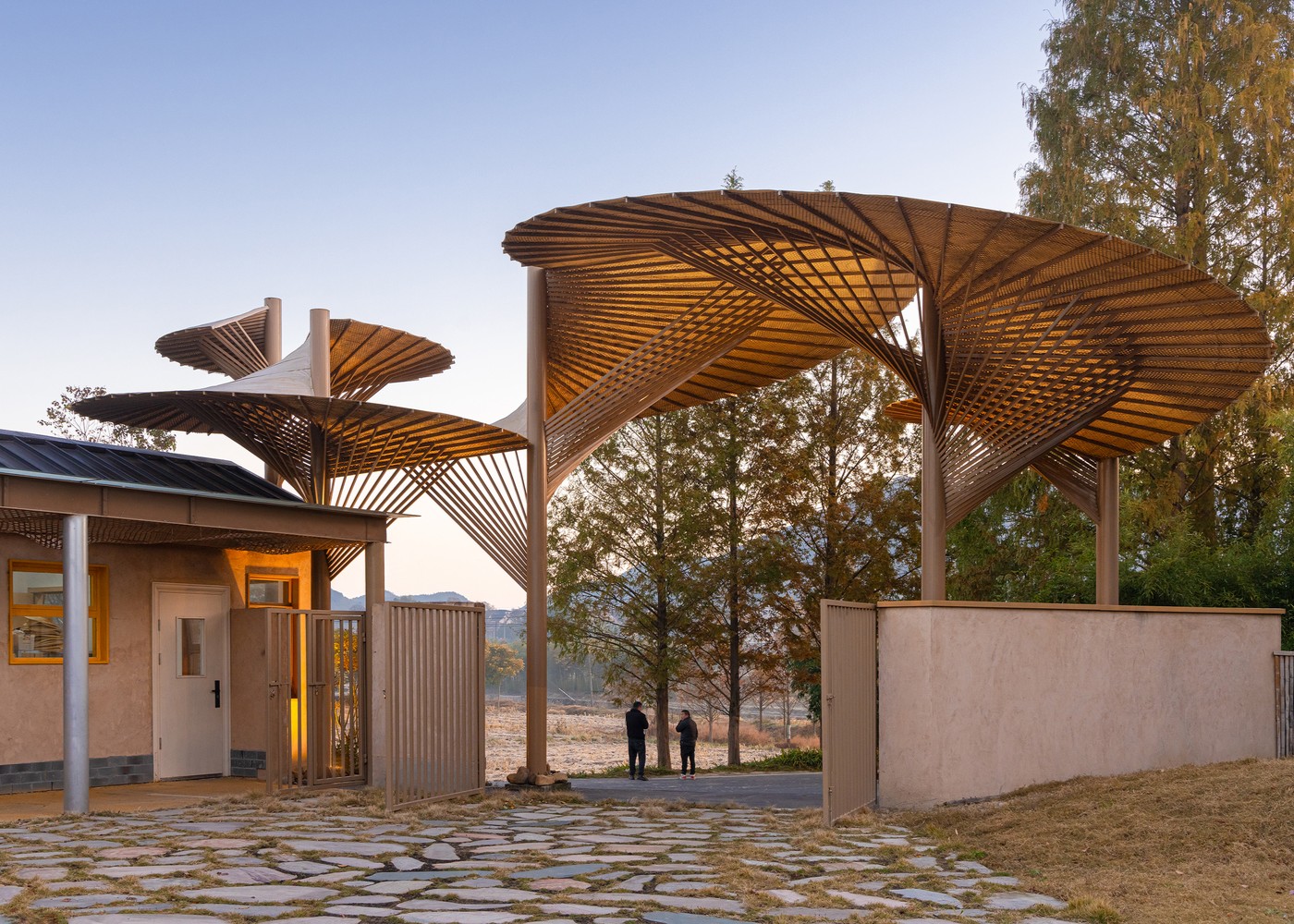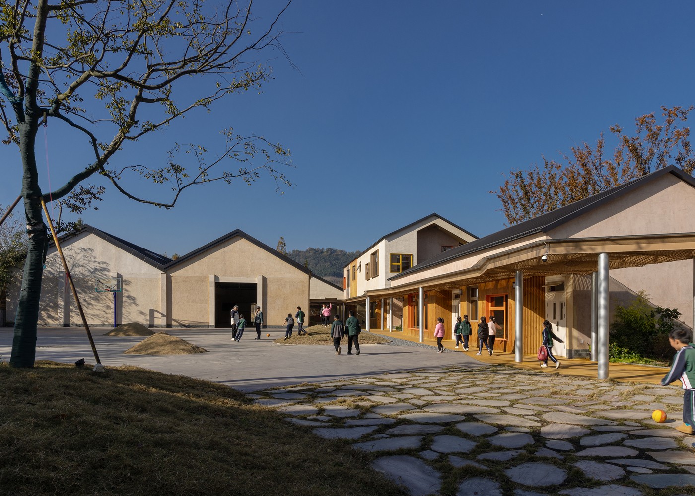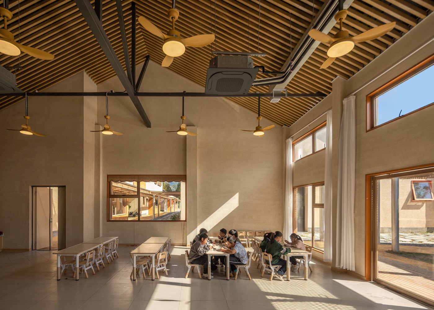Sınıflar, atölyeler ve sosyal alanlar, açık avlular etrafında konumlanmış ve bambudan örülmüş koridorlarla birbirine bağlanmıştır. Çocuklar ders aralarında toprağa basıyor, dere kenarında gözlem yapıyor, ağaç gölgelerinde düşünüyor…