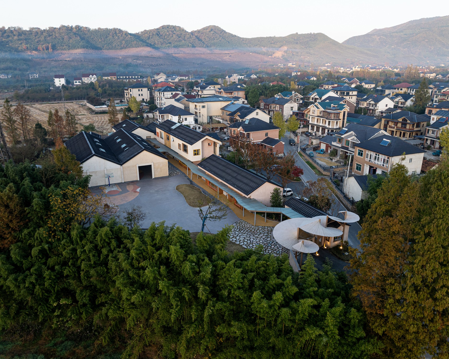 Çin’in Hangzhou şehrinin Yuhang bölgesindeki Qingshan Köyü’nde inşa edilen Qingshan Okulu, MOMENTUM Architects tarafından tasarlandı. Toplam 1740 metrekare alana sahiptir. Tasarımın temel amacı, öğrenmeyi kırsal yaşamla yeniden ilişkilendiren, çocuk merkezli bir ortam oluşturmaktı.