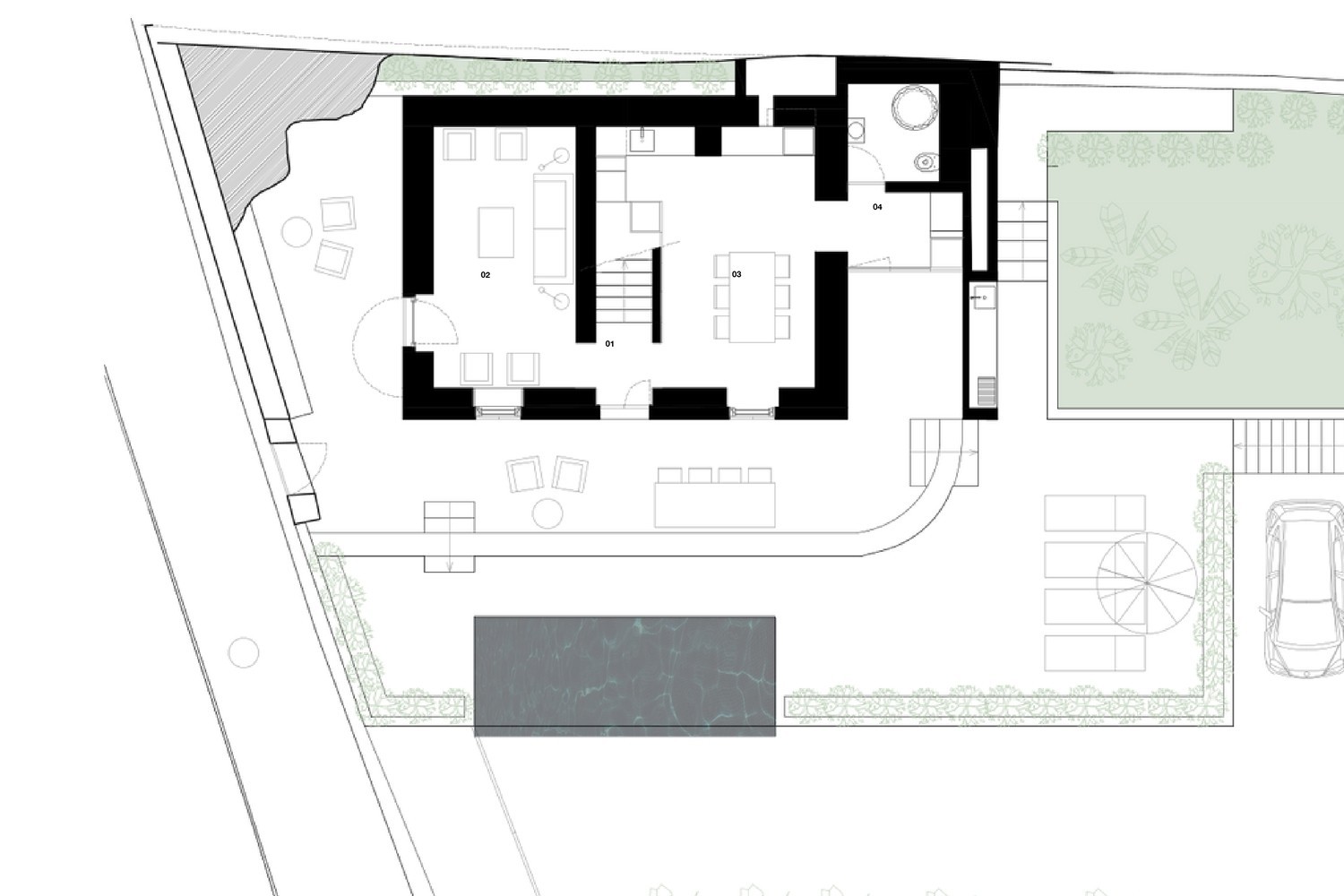 Plan düzeni büyük oranda korunmuş iç mekanda, yalnızca birinci kata bir banyo eklenmiş ve şarap mahzeni oturma odasına dönüştürülmüştür. Böylece evin ön cephesi boyunca uzanan, oturma odasıyla yemek odası ve mutfağı birbirine bağlayan sosyal bir eksen oluşturuldu.