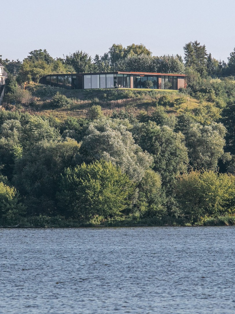 Polonya’da Vistül Nehri kıyısındaki yamaca gömülü House in the Slope, 77 Studio Architecture tarafından tasarlandı. Tek katlı 450 metrekarelik evin hikayesi, sahibinin Vistül kıyısındaki favori seyir noktasında yaşama hayalinden doğmuştur. Tasarım ekibi, binanın en önemli özelliğini nehirle kurulan görsel ve mekânsal ilişki olarak belirlemiştir.