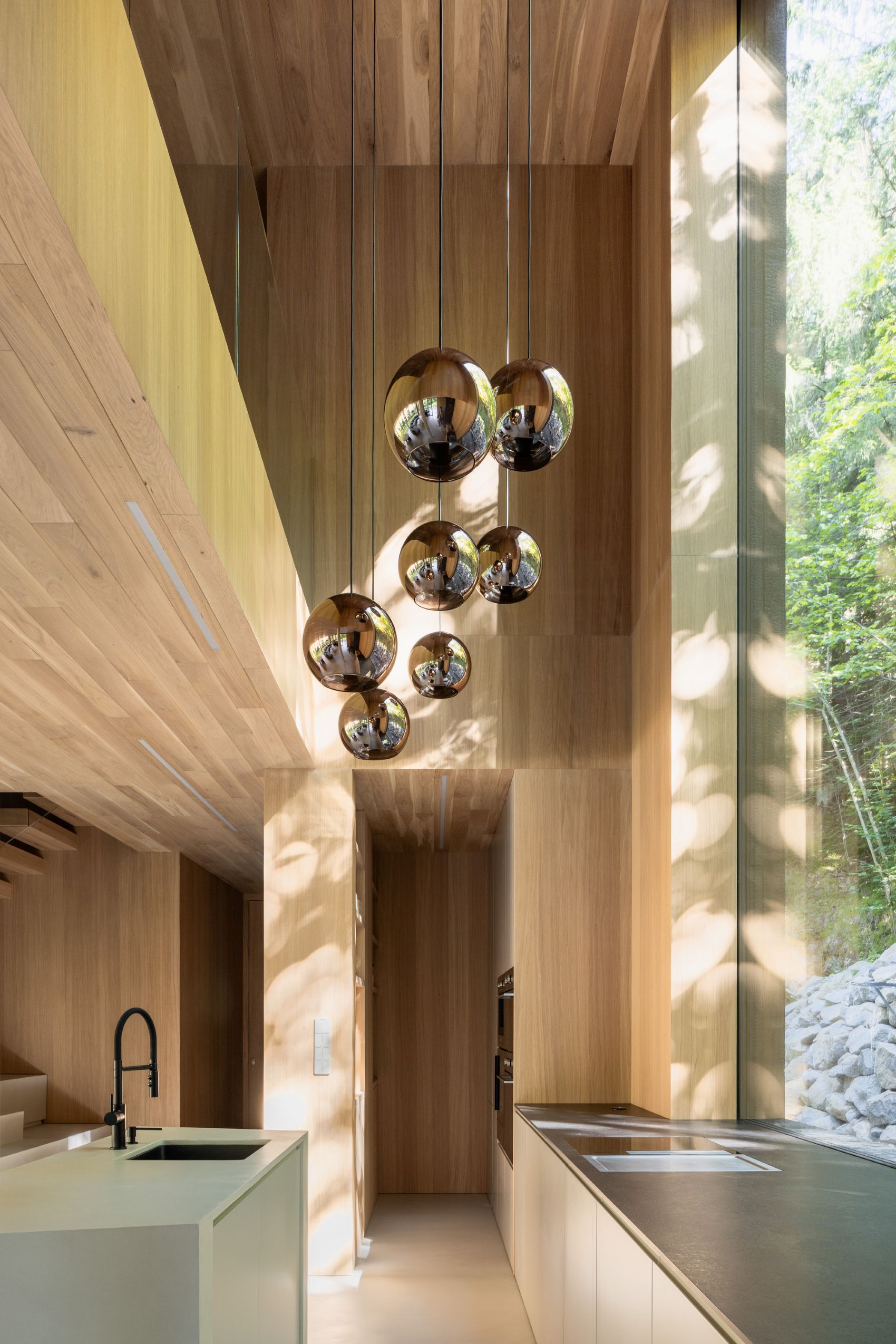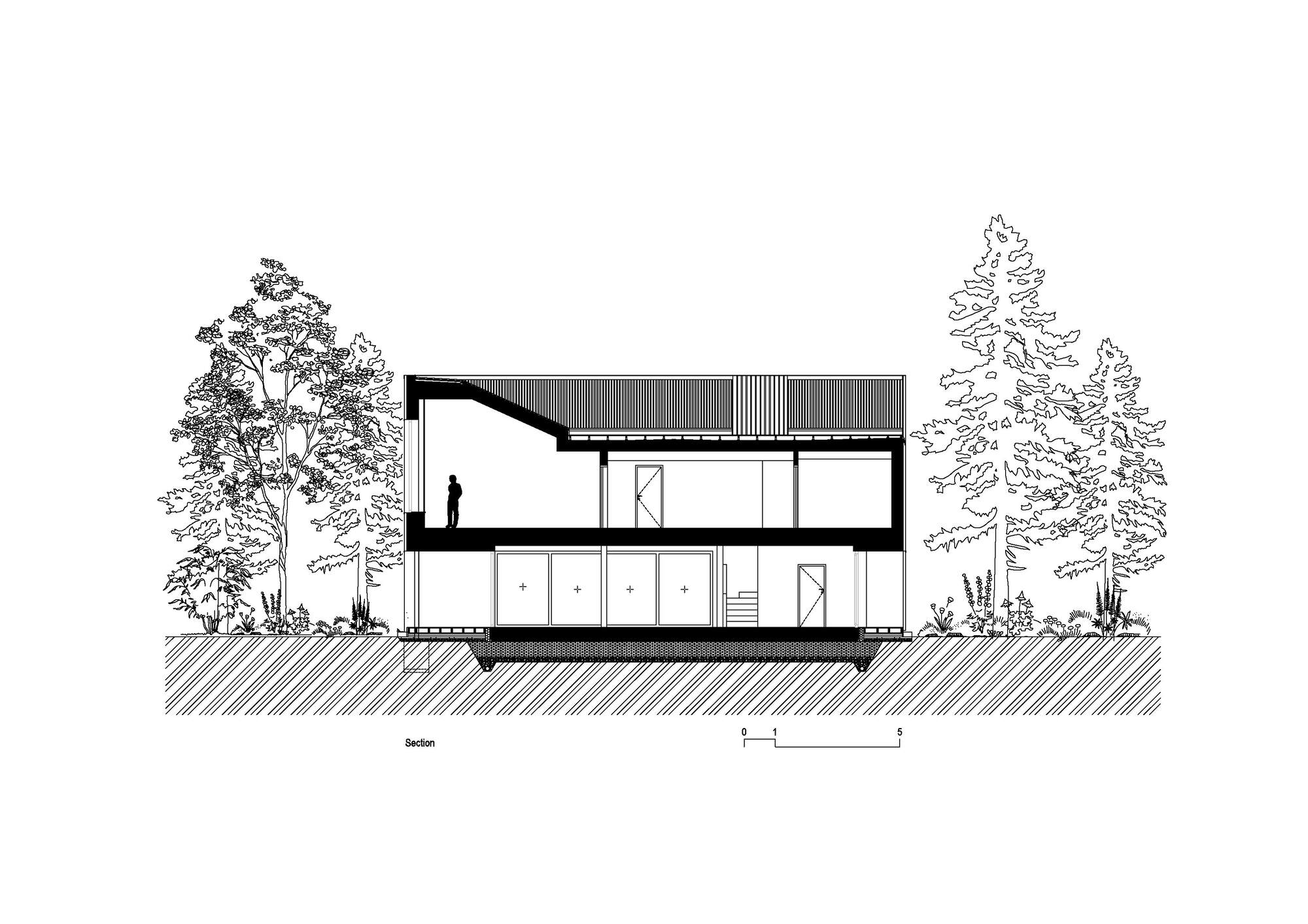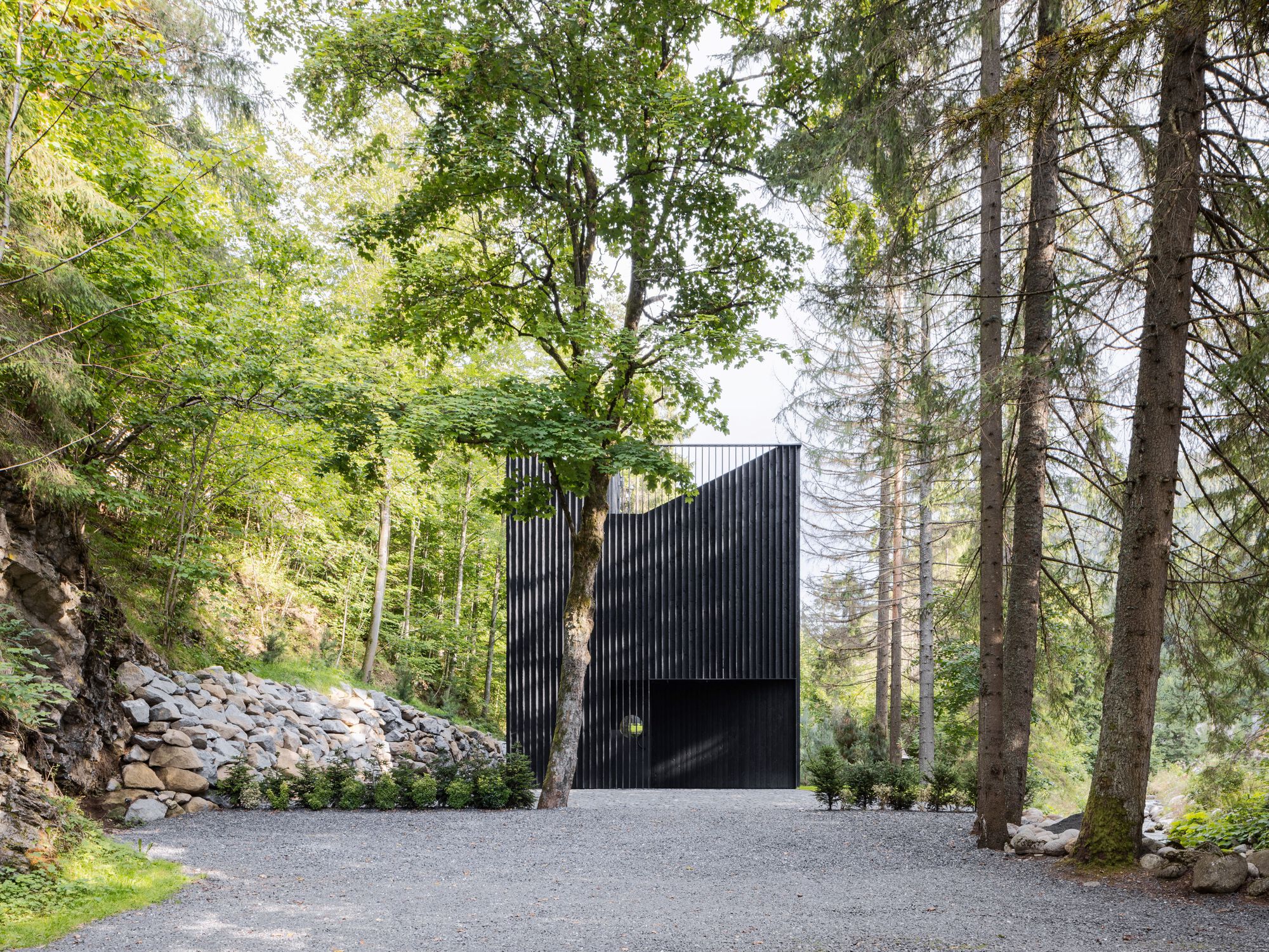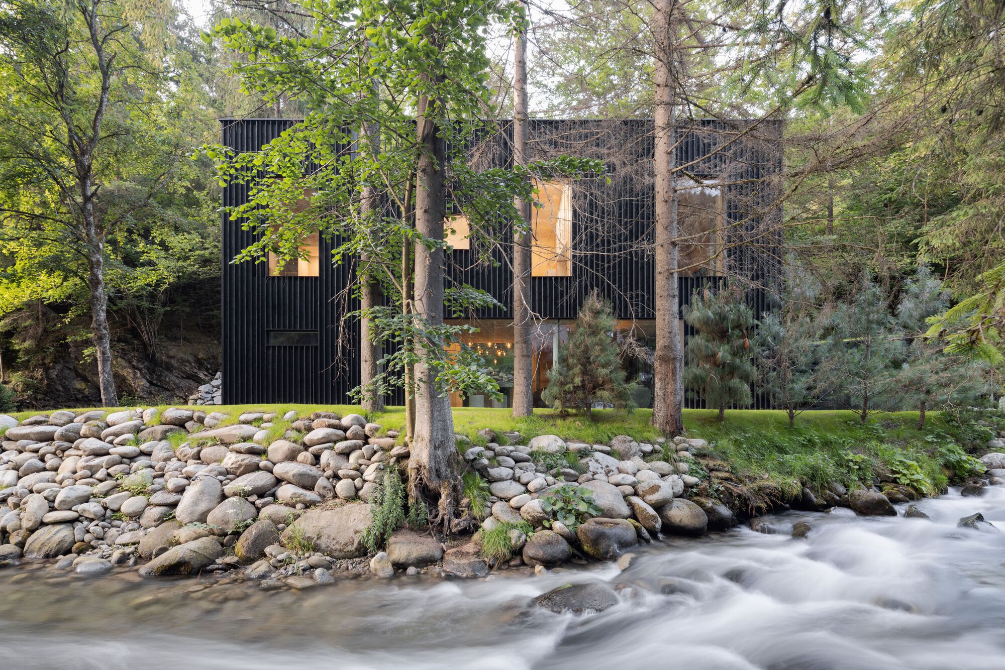 Arsa üzerinde daha önce bulunan eski bir evin ayak izine sadık kalınarak inşa edilen yeni yapının ana formu, çevreyle doğrudan ilişki kuran sade bir prizmadır. Derenin akışına paralel biçimde konumlanan yapının geniş cam yüzeyleri aracılığıyla suyun sürekli değişen manzarası içeri taşınıyor.