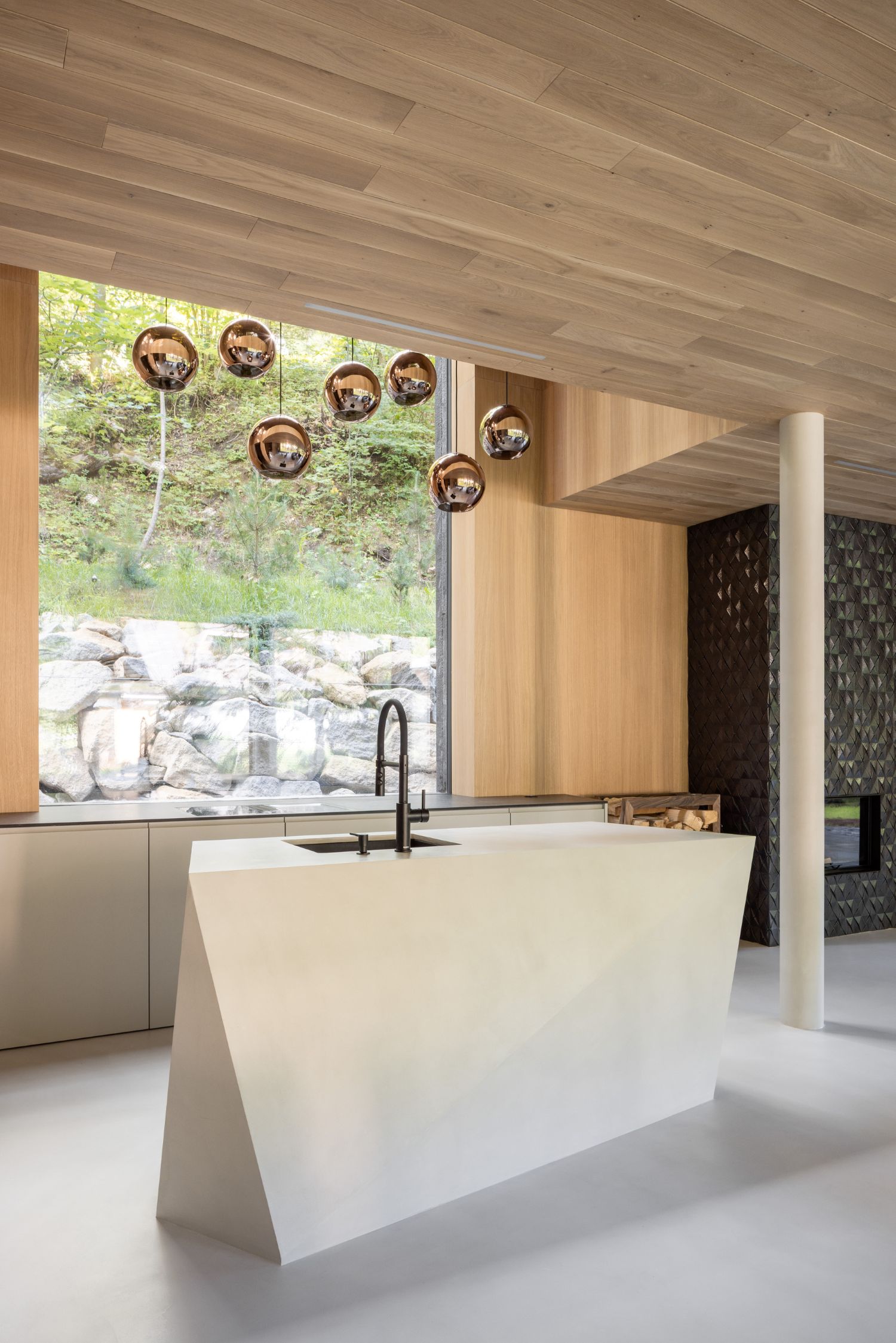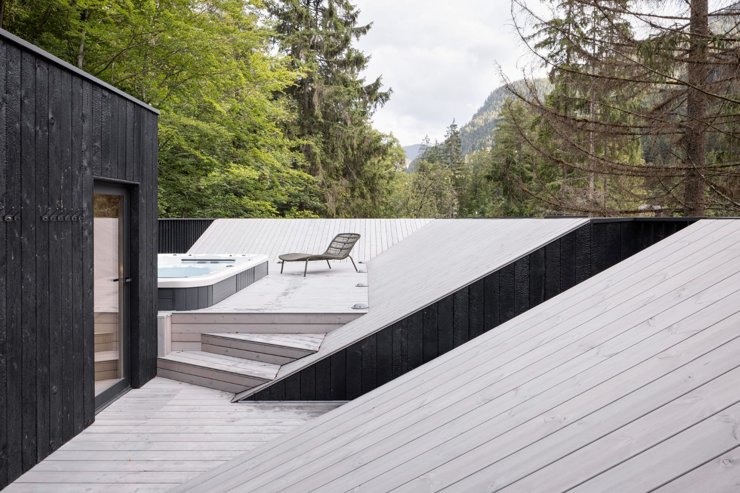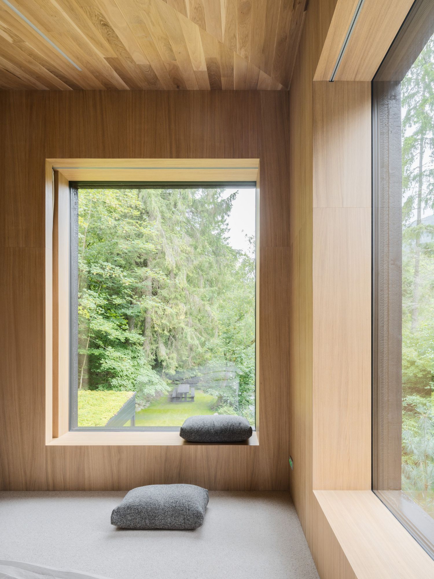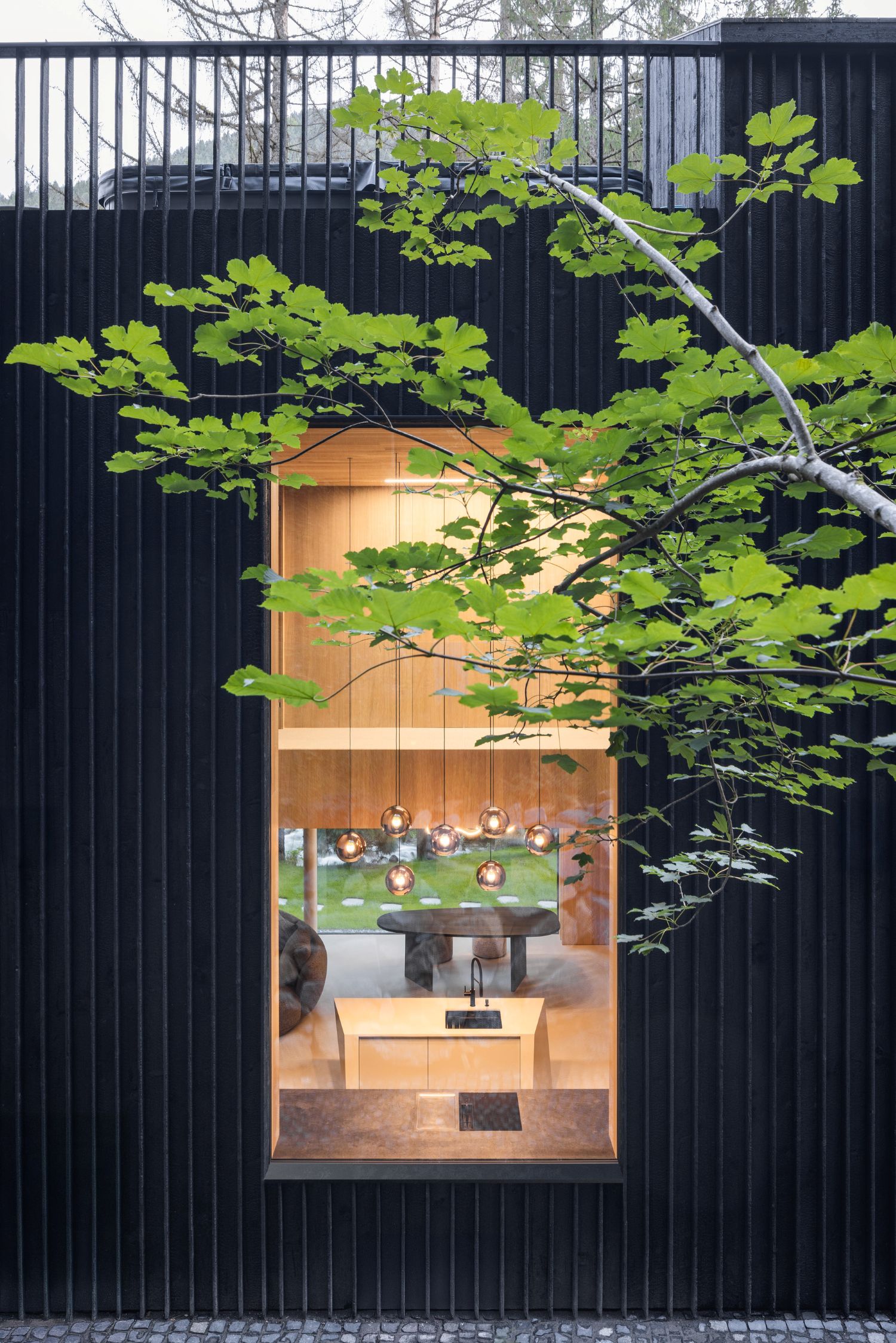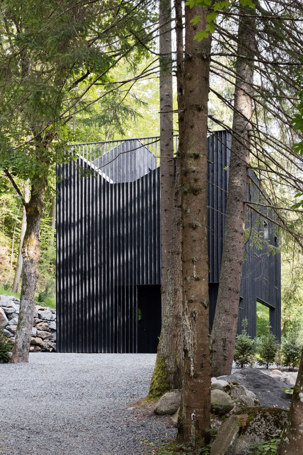 Dış cephe, geleneksel Japon Yakisugi tekniği kömürleştirilmiş ahşapla kaplanmıştır. Bu yöntem, malzemenin dayanıklılığını ve yangın direncini artırırken, mat siyah rengiyle ormanın koyu tonlarına karışarak yapıyı görünmez kılar. İç mekânda duvar ve tavanlarda ahşap kaplama, zeminlerde mikro çimento tercih edilmiştir. Sade mobilyalar ve doğal dokular gösterişten uzak, huzurlu bir atmosfer yaratarak ışığın yumuşak geçişleriyle birlikte mekâna dinginlik kazandırıyor.