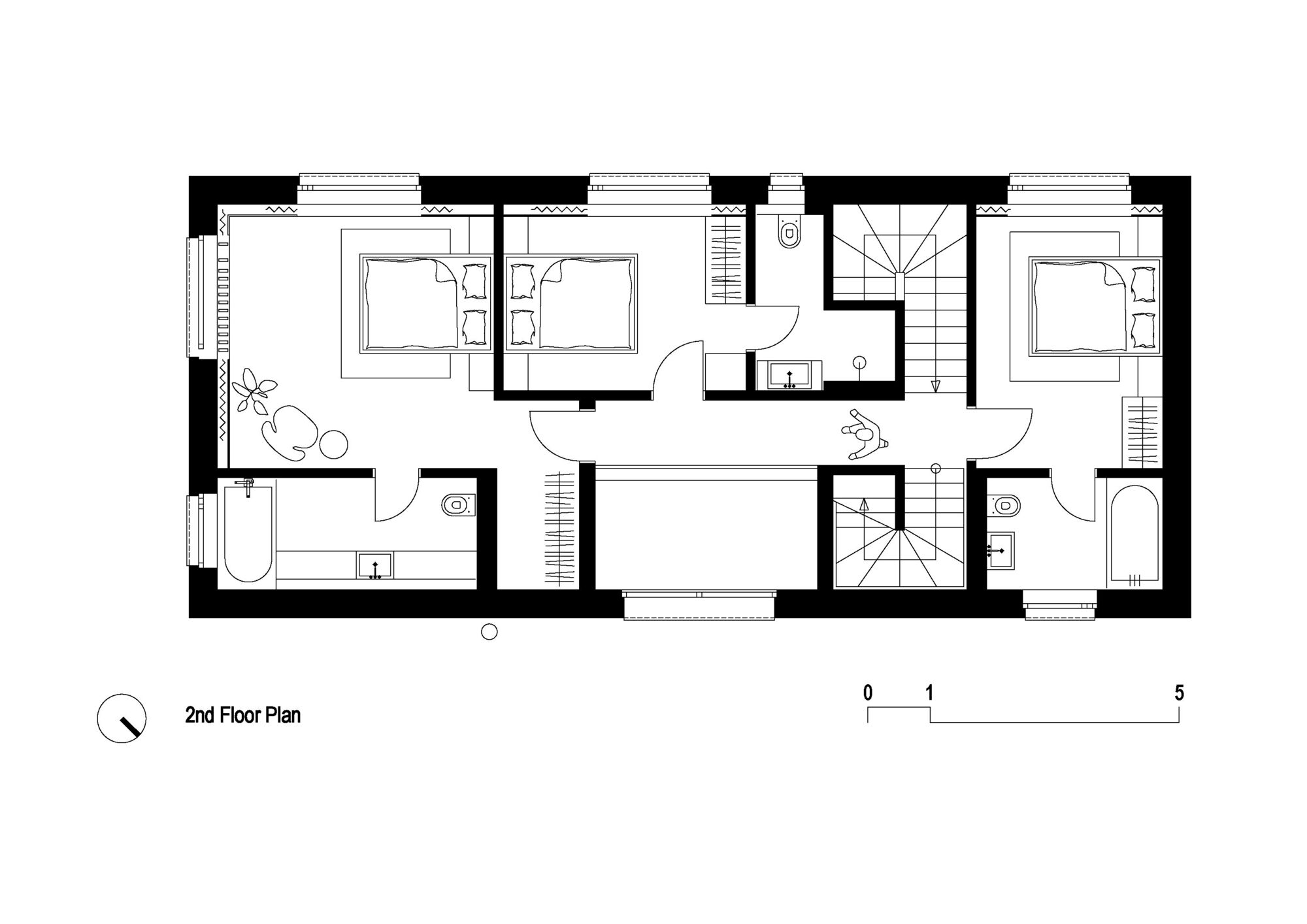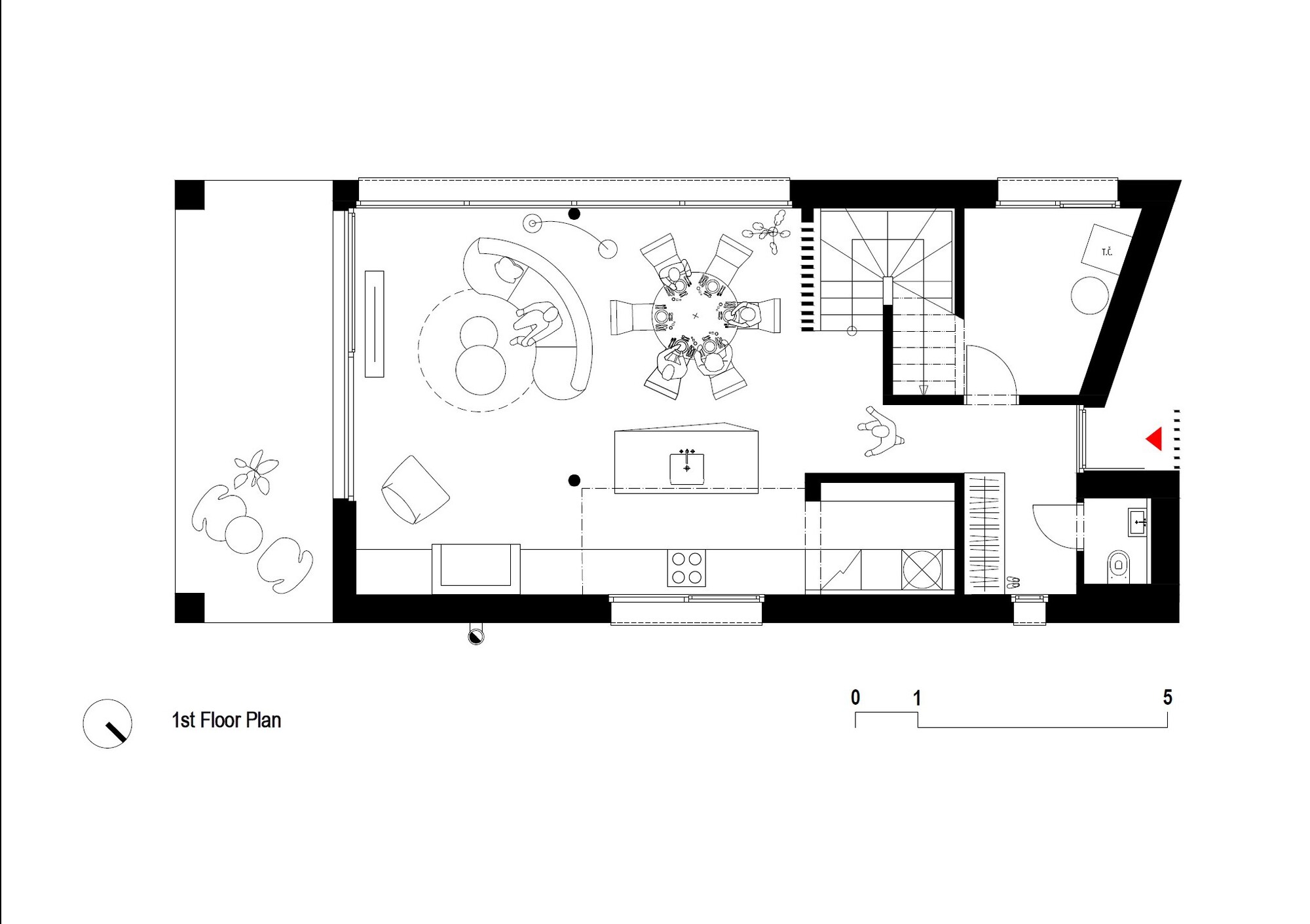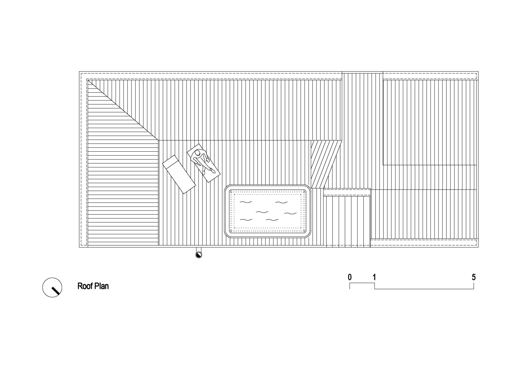 114 metrekarelik evin zemin katında oturma, yemek ve mutfak alanlarını içeren açık planlı ana yaşam alanı, çalışma odası, wc ve giriş bulunuyor. Üst katta ise her biri banyolu üç yatak odası bulunuyor. Çatı terasında ise jakuziyle tamamlanan bir dinlenme alanı yer alır. Eğimli çatıların oluşturduğu “ters topografya” sayesinde, yapı hem mahremiyet kazanıyor hem de gökyüzüne açılıyor.