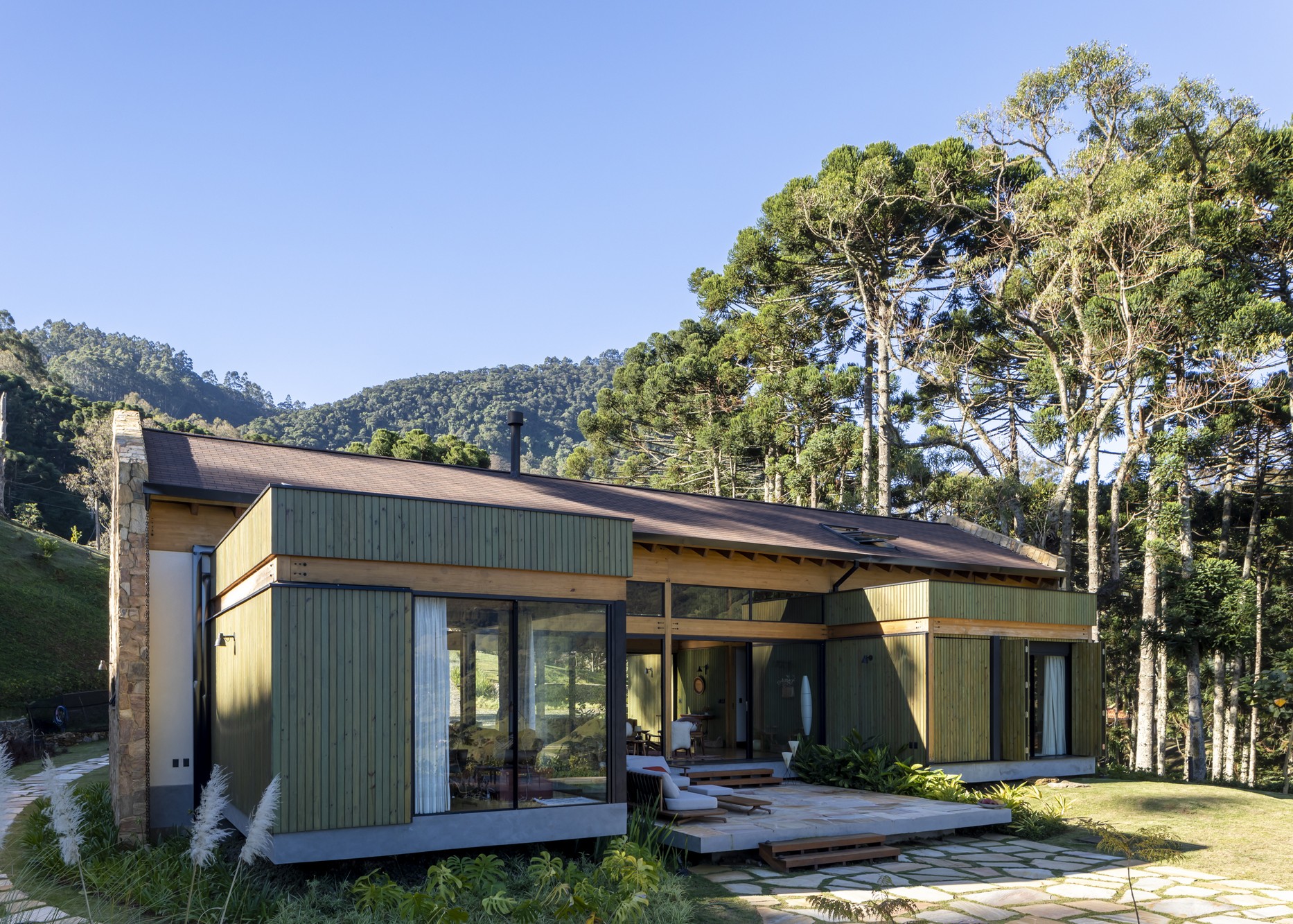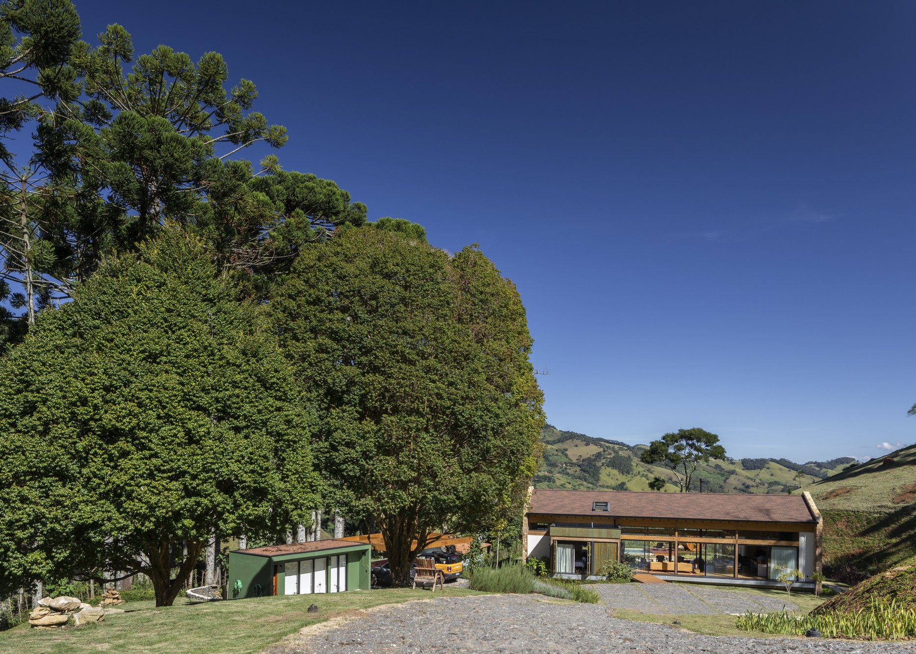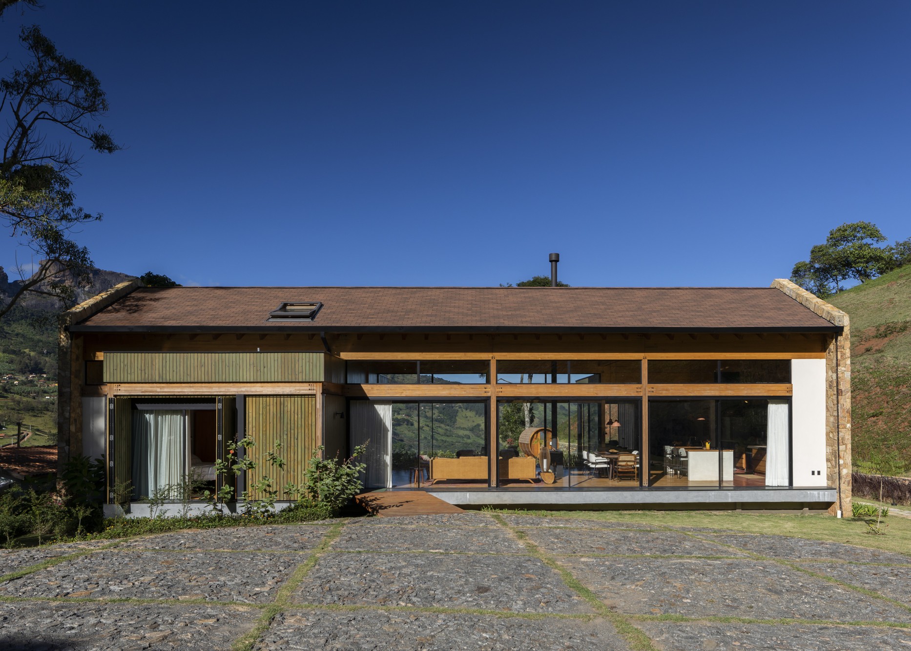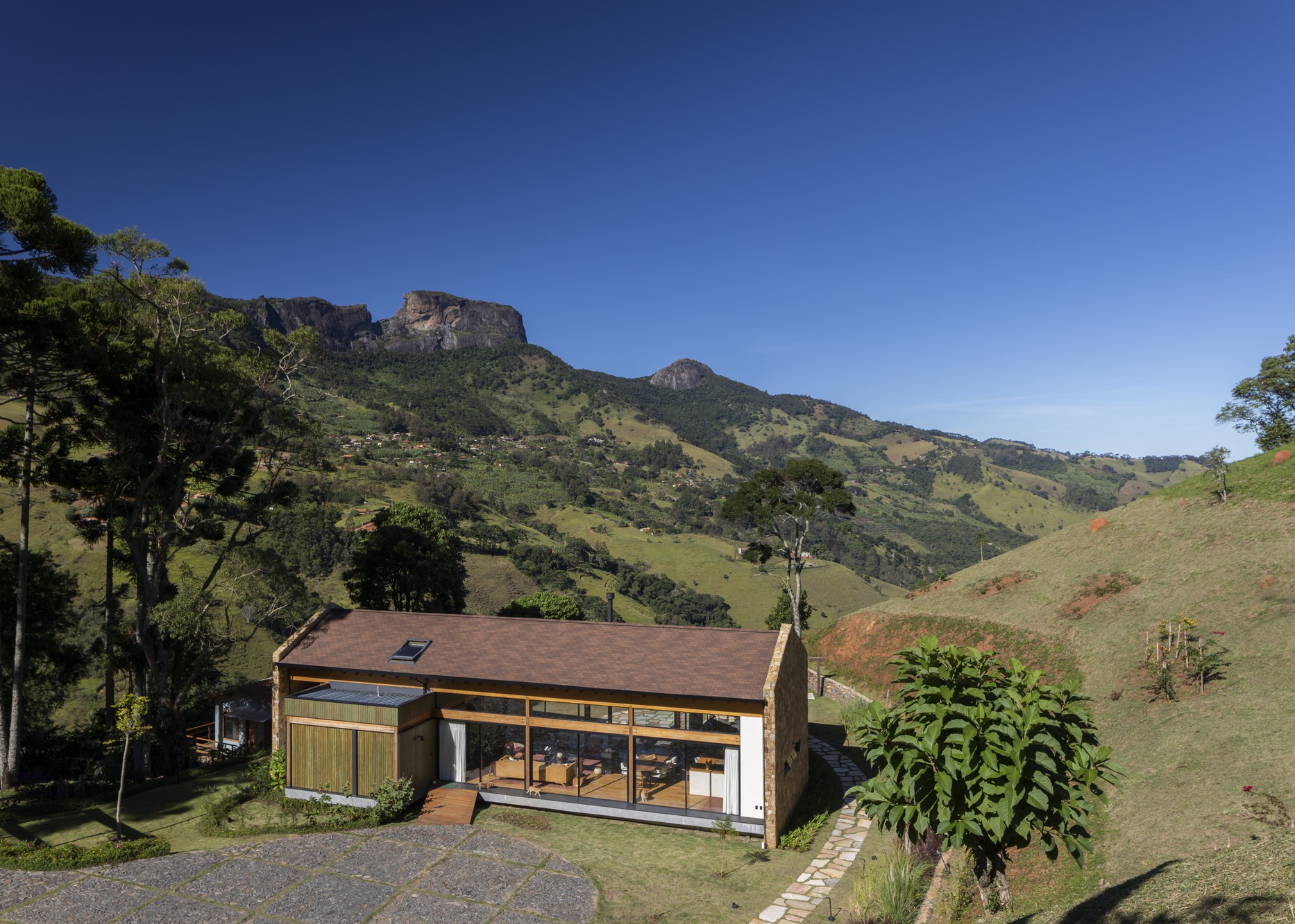 Brezilya’nın São Paulo şehrinin São Bento do Sapucaí kasabasında konumlanan Vale Verde Evi, Bruschini Arquitetura tarafından tasarlandı. Ev sahiplerinin isteği doğrultusunda tasarımda sadelik, işlevsellik ve estetik ön planda tutulmuştur. 260 metrekarelik yapı, beşik çatıyla örtülü düz uzunlamasına kurgulanan ana blok ve ona eklemlenen düz çatılı üç modülden oluşuyor.