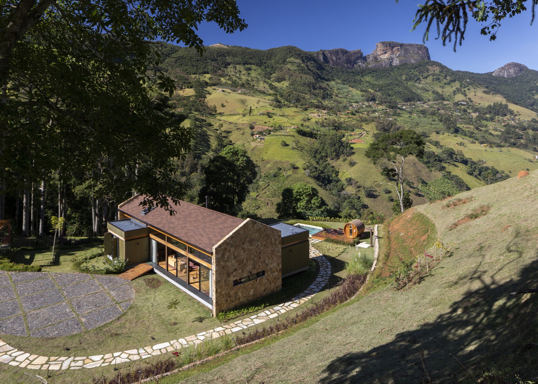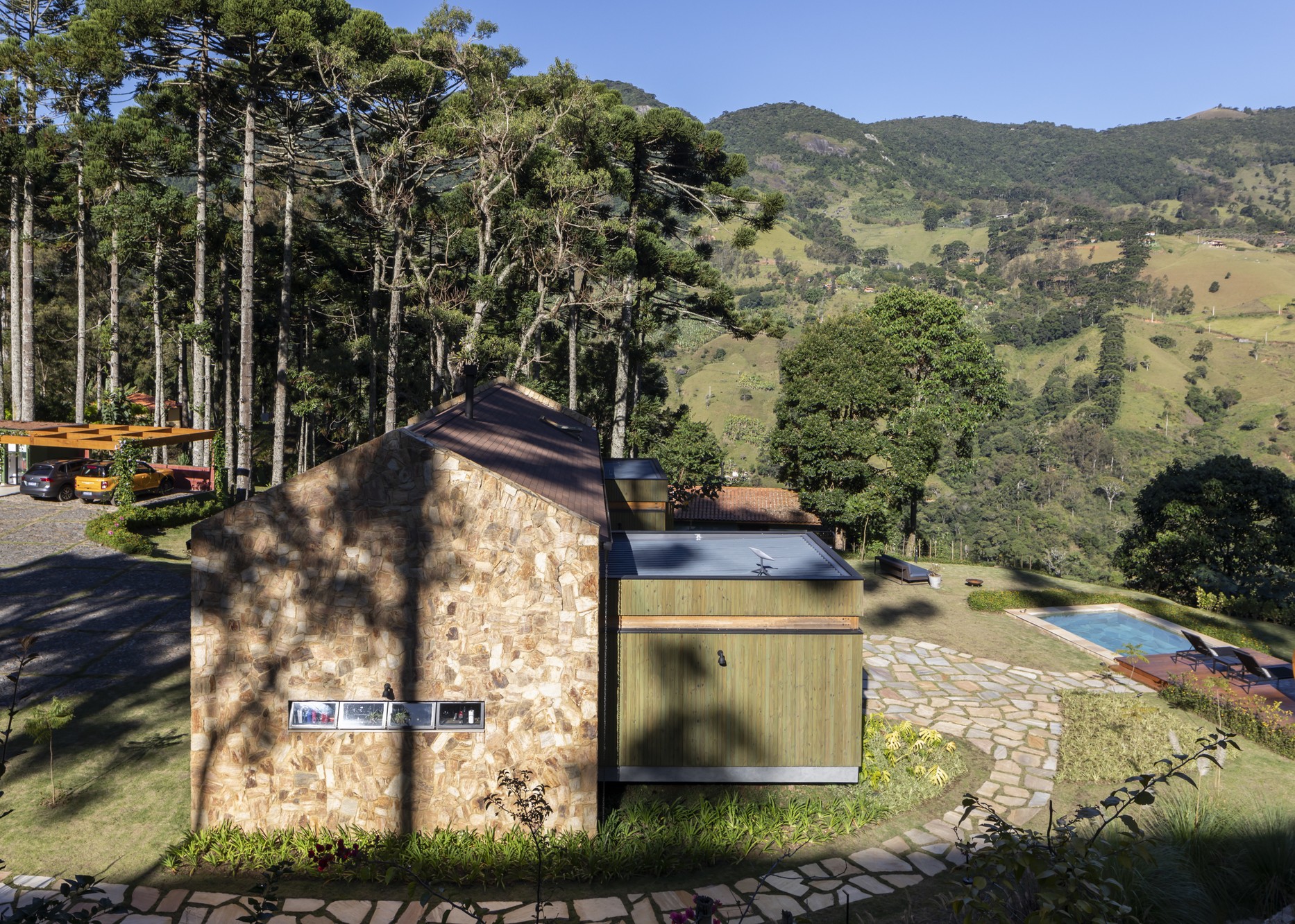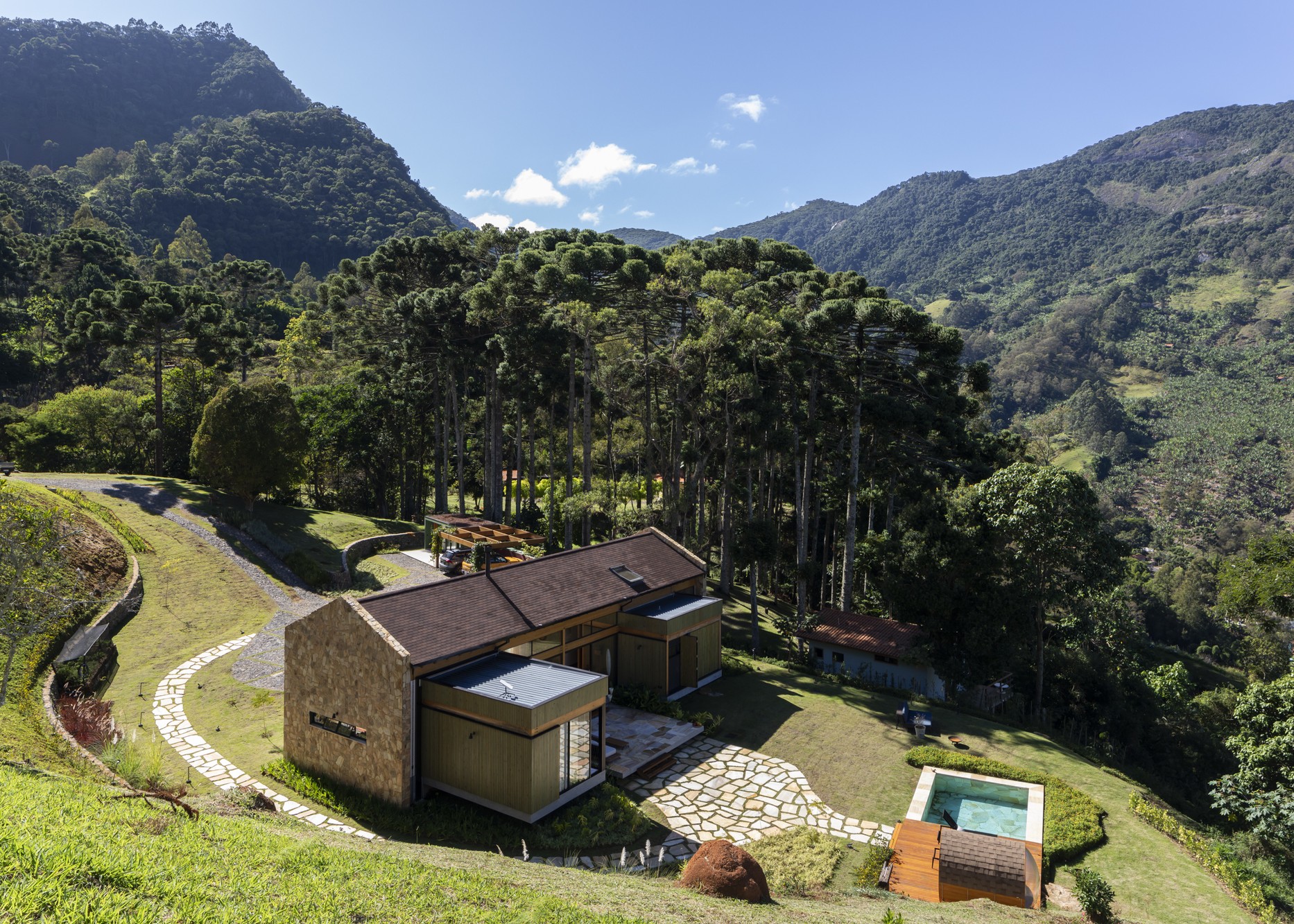 Brezilya’nın São Paulo şehrinin São Bento do Sapucaí kasabasında konumlanan Vale Verde Evi, Bruschini Arquitetura tarafından tasarlandı. Ev sahiplerinin isteği doğrultusunda tasarımda sadelik, işlevsellik ve estetik ön planda tutulmuştur. 260 metrekarelik yapı, beşik çatıyla örtülü düz uzunlamasına kurgulanan ana blok ve ona eklemlenen düz çatılı üç modülden oluşuyor.