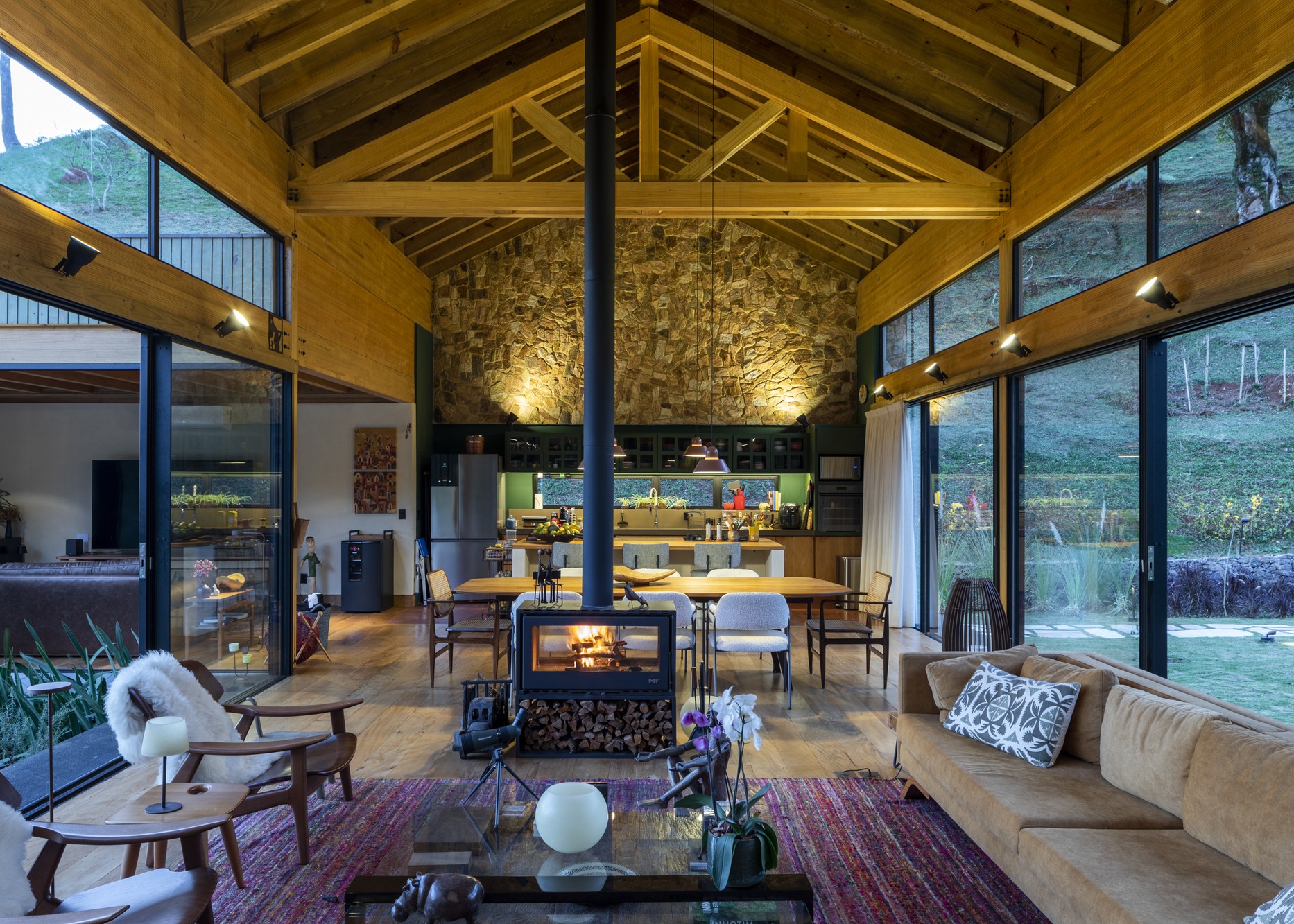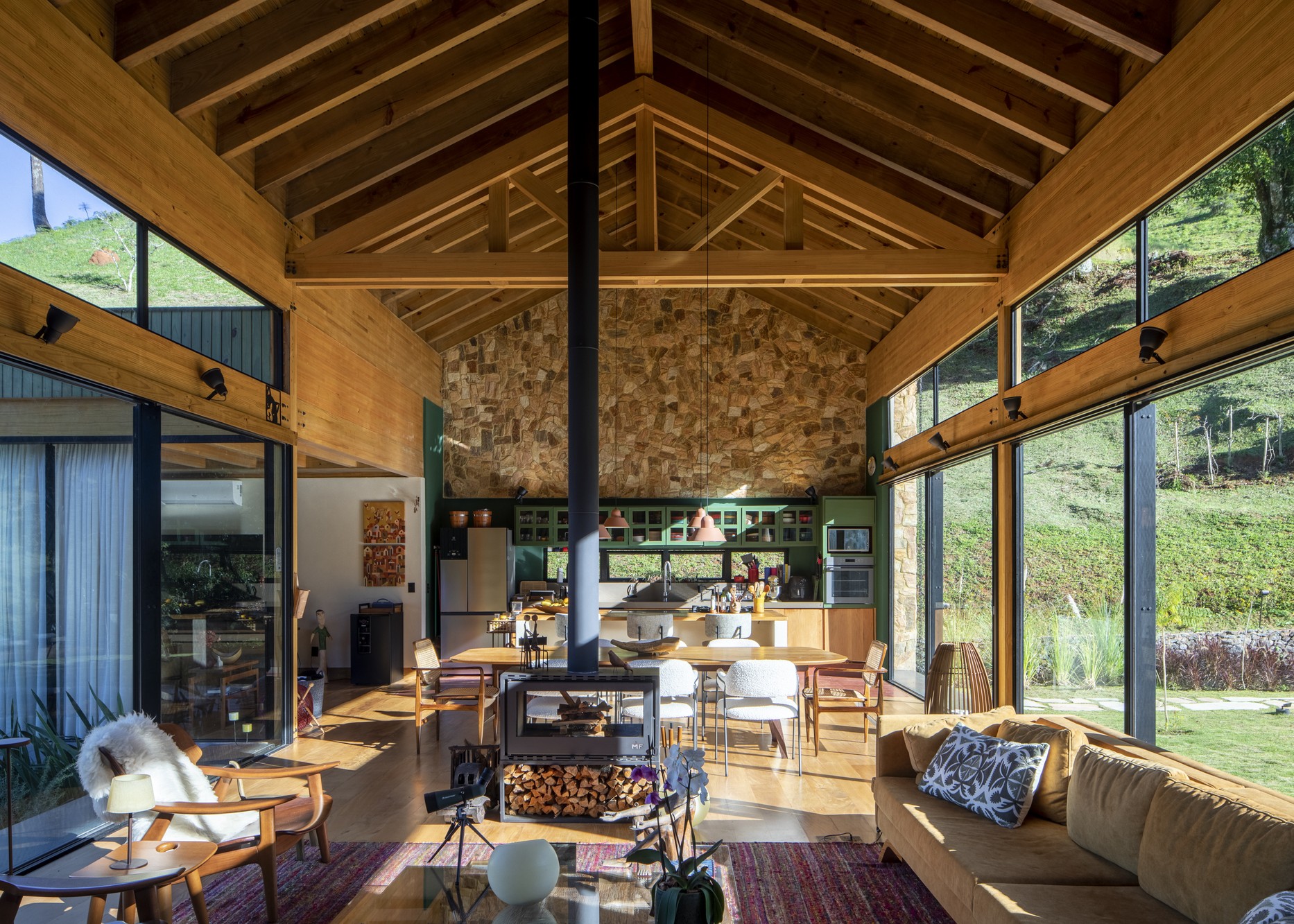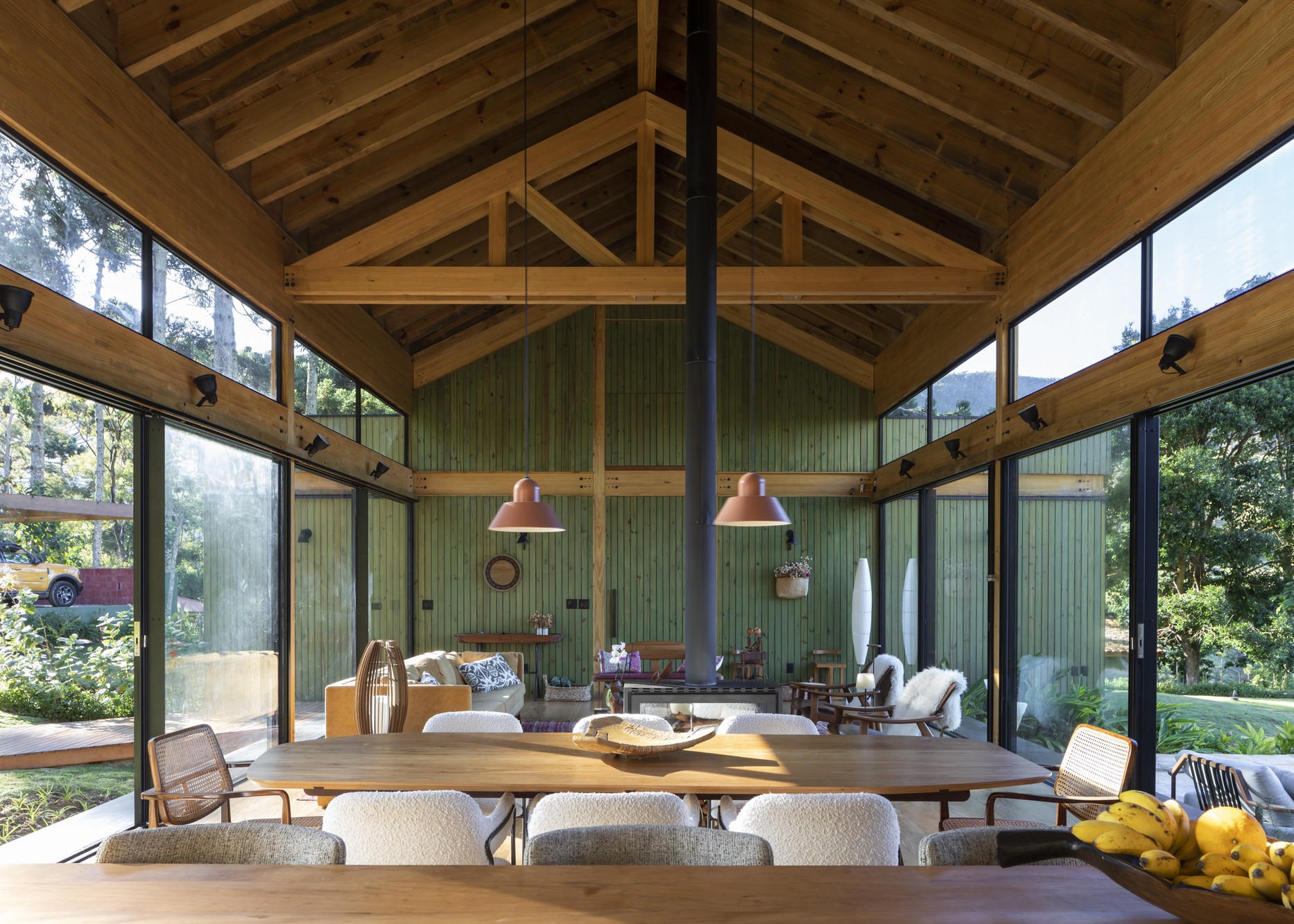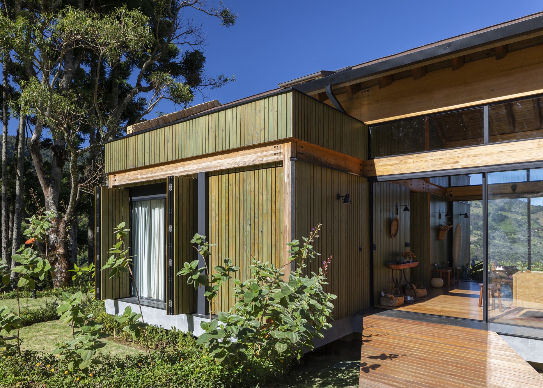 Brezilya’nın São Paulo şehrinin São Bento do Sapucaí kasabasında konumlanan Vale Verde Evi, Bruschini Arquitetura tarafından tasarlandı. Ev sahiplerinin isteği doğrultusunda tasarımda sadelik, işlevsellik ve estetik ön planda tutulmuştur. 260 metrekarelik yapı, beşik çatıyla örtülü düz uzunlamasına kurgulanan ana blok ve ona eklemlenen düz çatılı üç modülden oluşuyor.