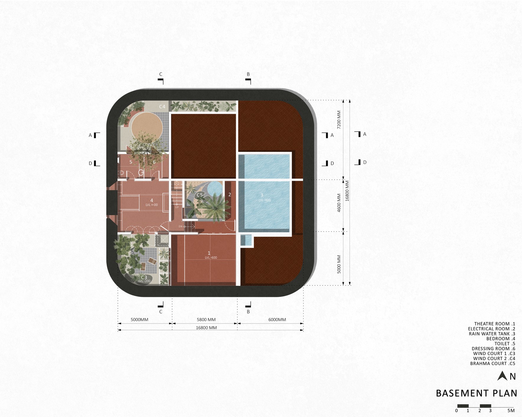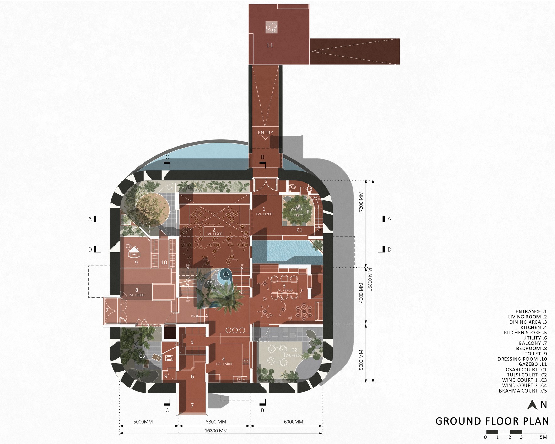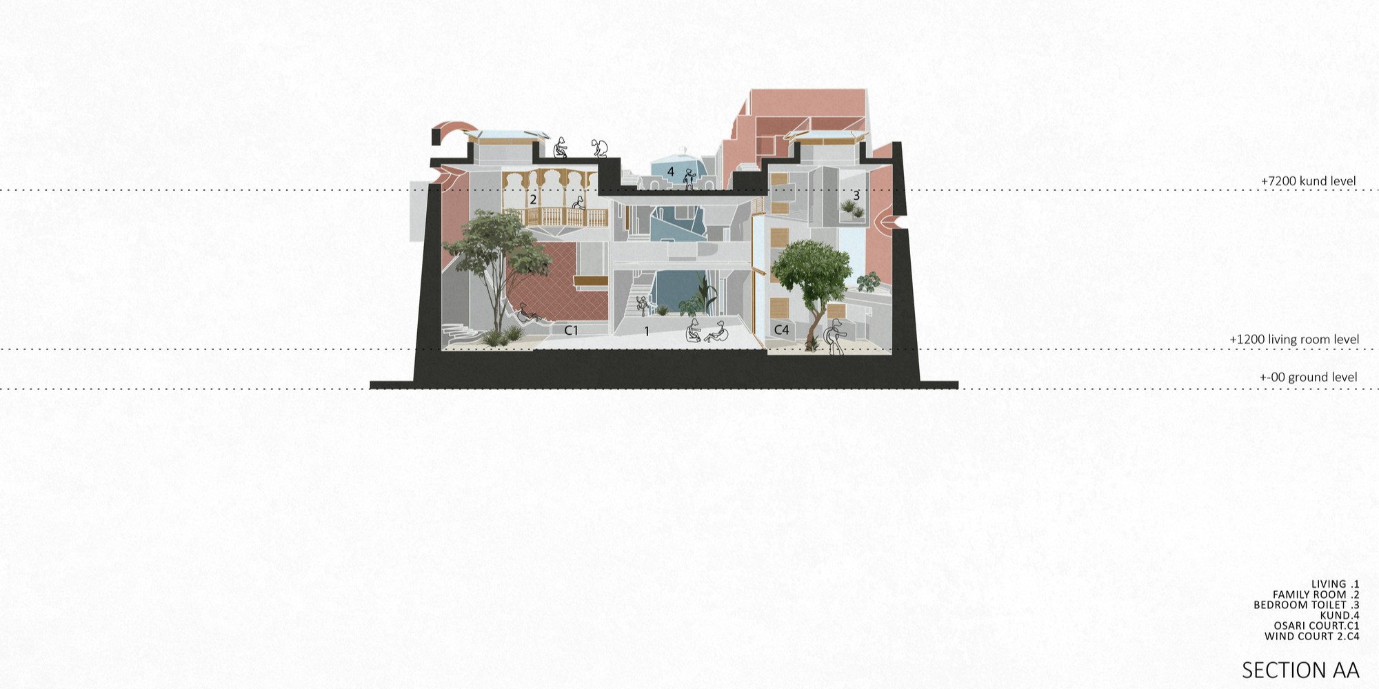 Tasarımın çıkış noktası, bölgesel bir konut tipi olan “Gadi”dir. Dışa kapalı, kalın duvarlarla çevrili bu geleneksel tipoloji; iç avlular, balkonlar ve ortak alanlarla zenginleşir. Bu anlayış, modern ihtiyaçlar ve güncel yapım sistemleriyle yeniden yorumlanarak zamansız bir mimari kimlik kazanır. Mekânsal organizasyon, geleneksel mimarideki “Khand” modülüne dayanır. Bu modüller haç plan düzeninde bir araya getirilmiş, köşelerde gökyüzüne açık nefes alanları oluşturulmuş ve mekânlar düşeyde basamaklarla birbirine bağlanmıştır.