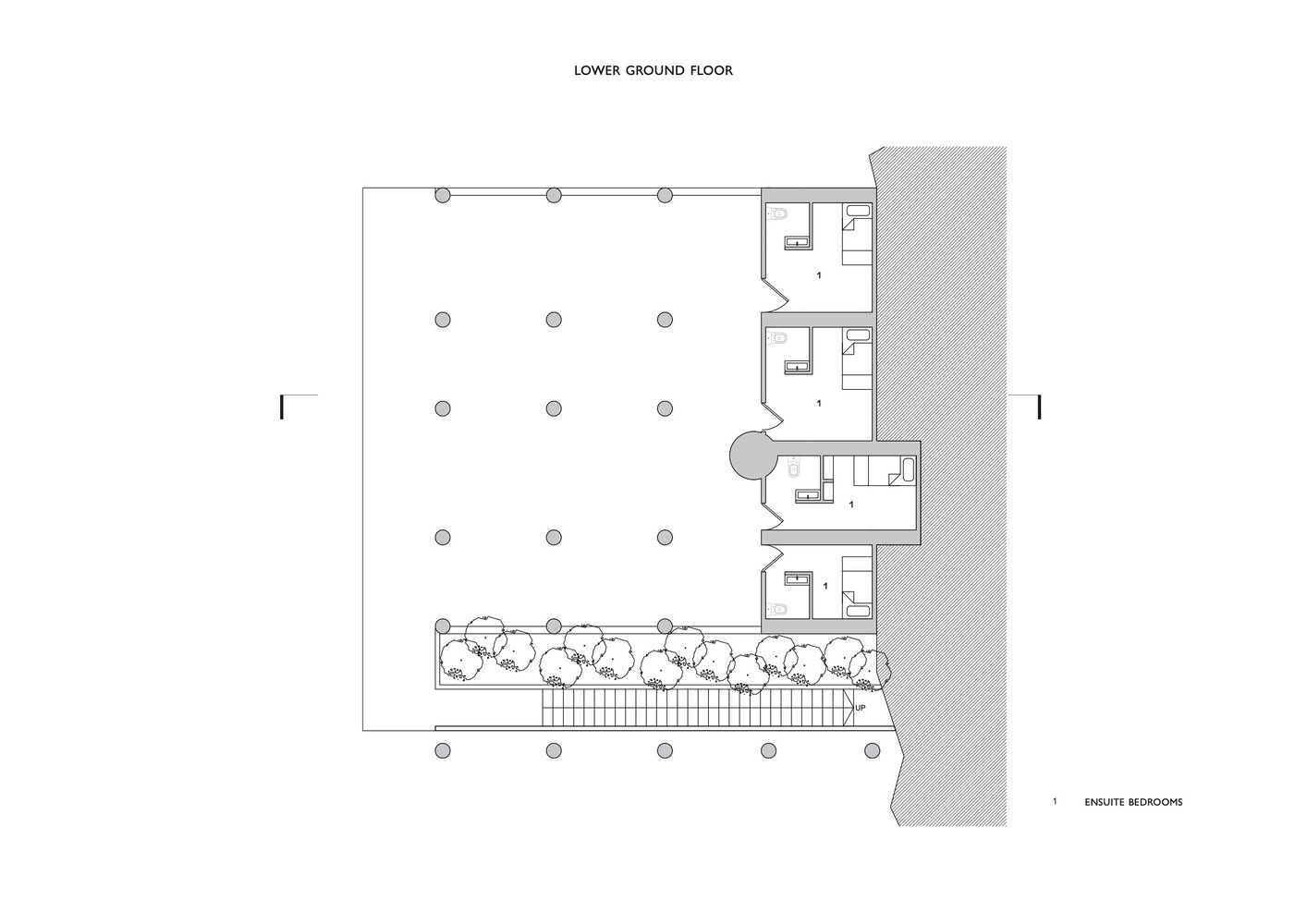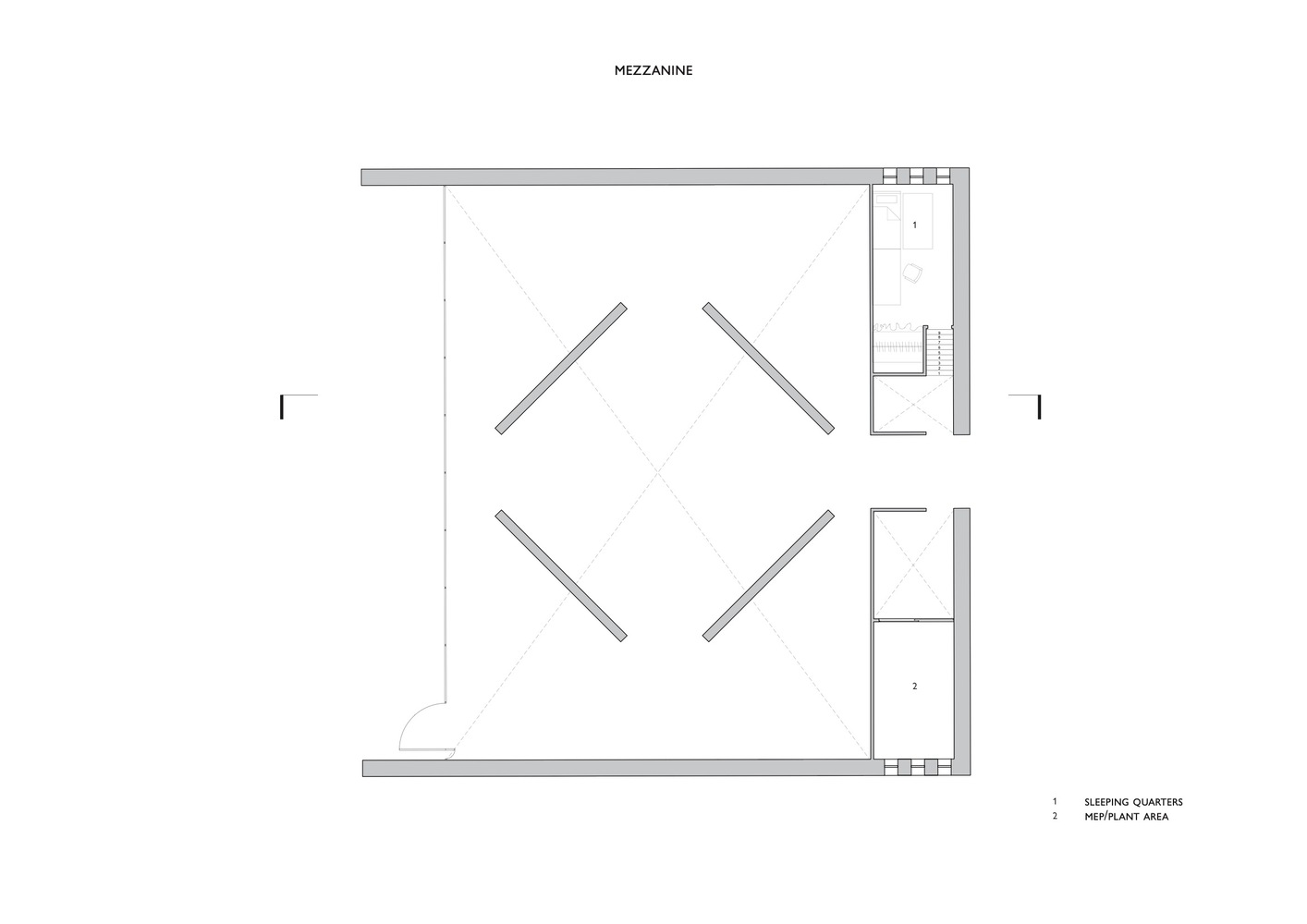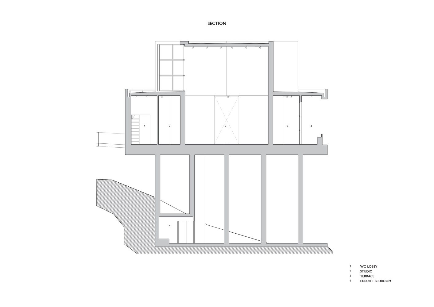 Binaya giriş, ağaçlarla çevrili bir yol boyunca ilerleyen kademeli bir deneyim sunan bir yaklaşımla tasarlandı. Zemin katta yapının merkezinde yer alan ana stüdyo, geniş ve aydınlık bir üretim alanı sunuyor. Ayrıca bu katta ana giriş, mutfak, banyo, ofis ve depolama alanları yer alıyor. Banyonun üstündeki asma katta bir yatak odası bulunurken, kolonların açıkta olduğu alt zemin katta ise, banyolu dört misafir odası var.