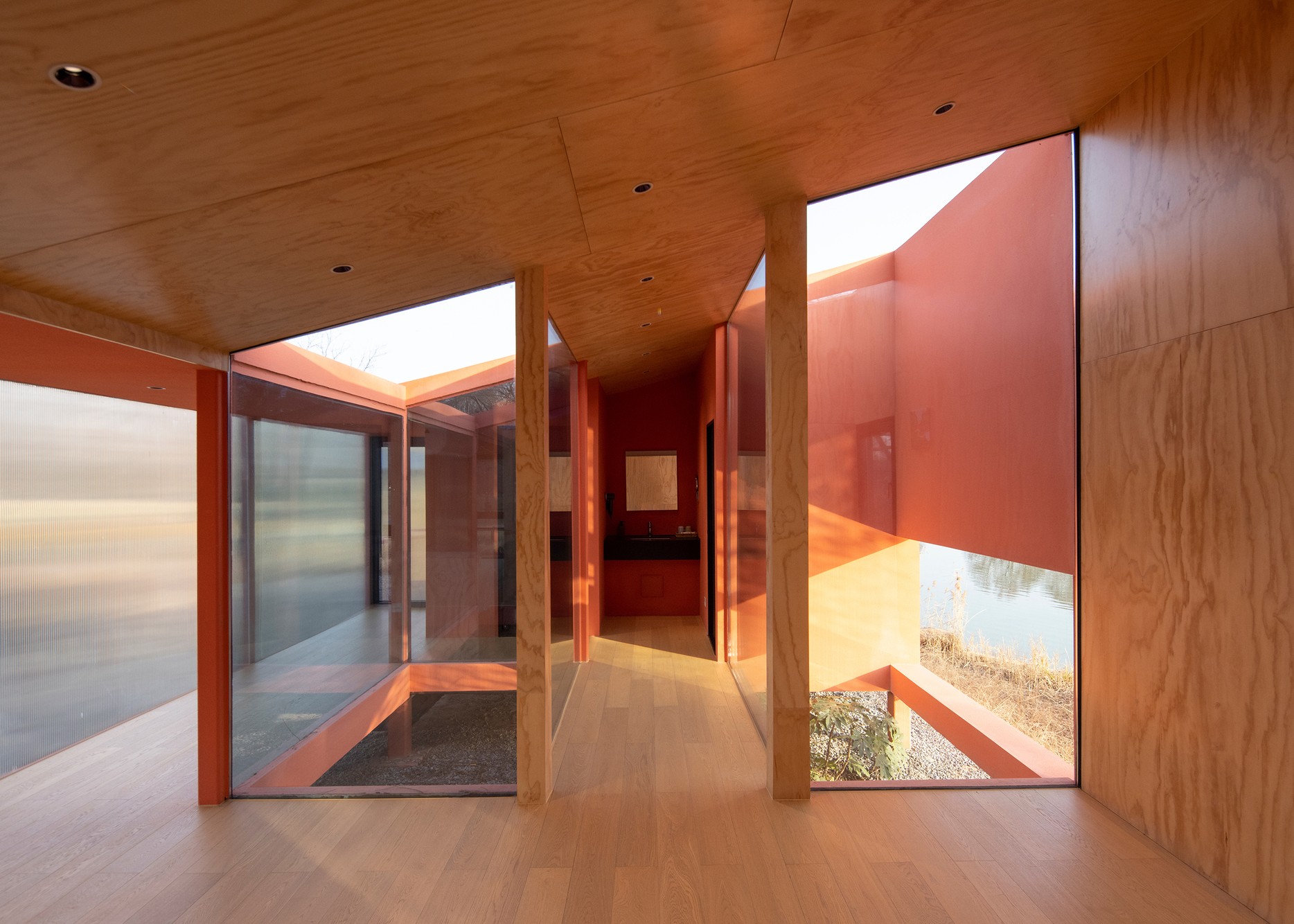 Dar, saydam bir köprüden nehir kıyısına ulaşıp, ahşapla çevrili bir ada evine adım atıyorsunuz. Yarı saydam yüzeyler dış manzarayı bulanıklaştırırken, çerçevelenmiş açıklıklar doğayı iç mekâna taşıyor. İki avlu ve geniş bir ışıklık yaşam alanının içinde bir peyzaj yaratıyor.