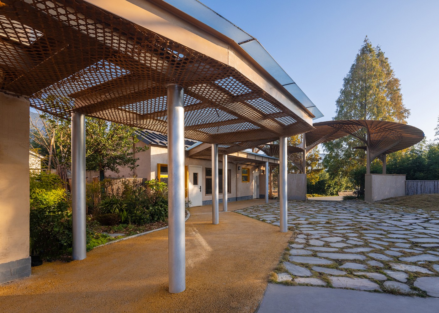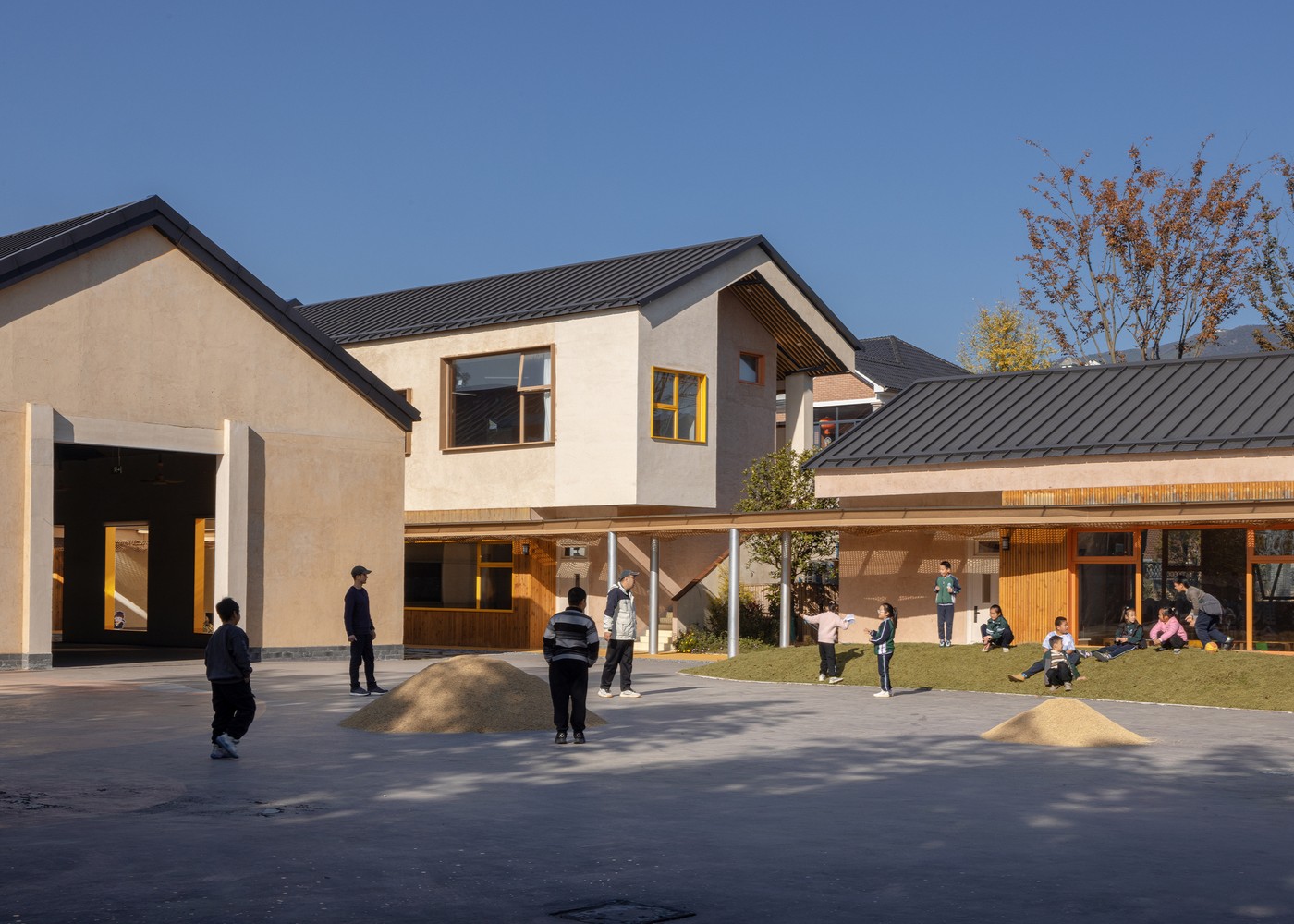 Yıkılmak zorunda kalan eski okulun izlerine saygı göstererek yeni yapıyı aynı ölçekte “öğrenme köyü” kavramıyla yeniden kurgulayan mimarlar, öğrenmenin yalnızca sınıflarda değil, doğanın her köşesinde gerçekleştiği bir mekan yarattı.