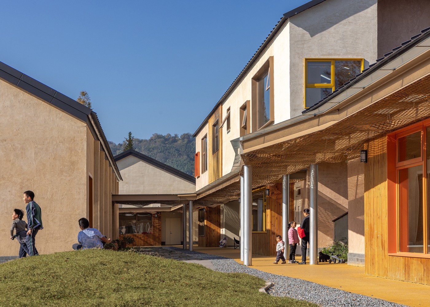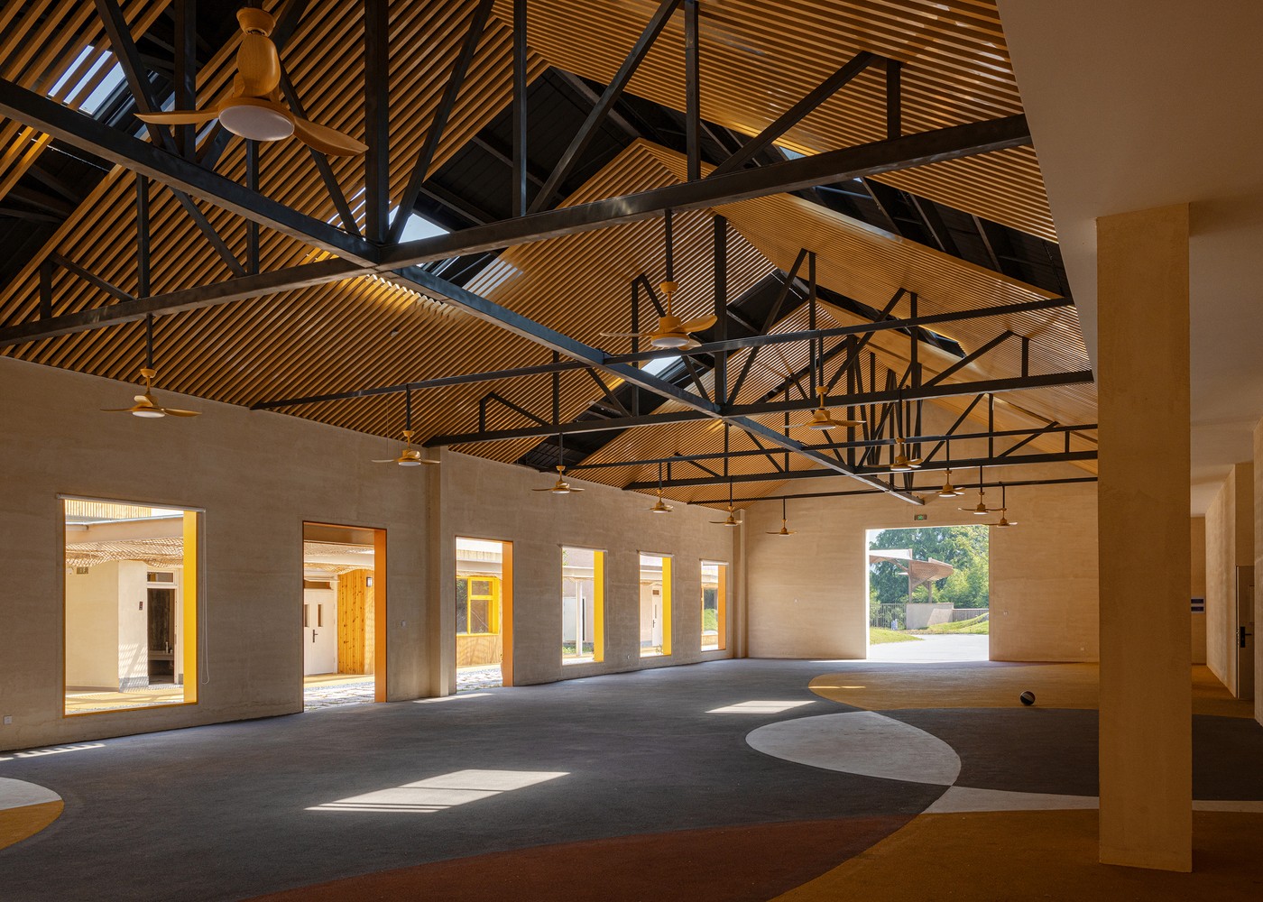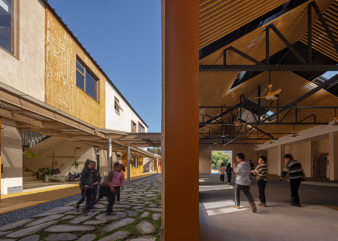 Sınıflar, atölyeler ve sosyal alanlar, açık avlular etrafında konumlanmış ve bambudan örülmüş koridorlarla birbirine bağlanmıştır. Çocuklar ders aralarında toprağa basıyor, dere kenarında gözlem yapıyor, ağaç gölgelerinde düşünüyor…