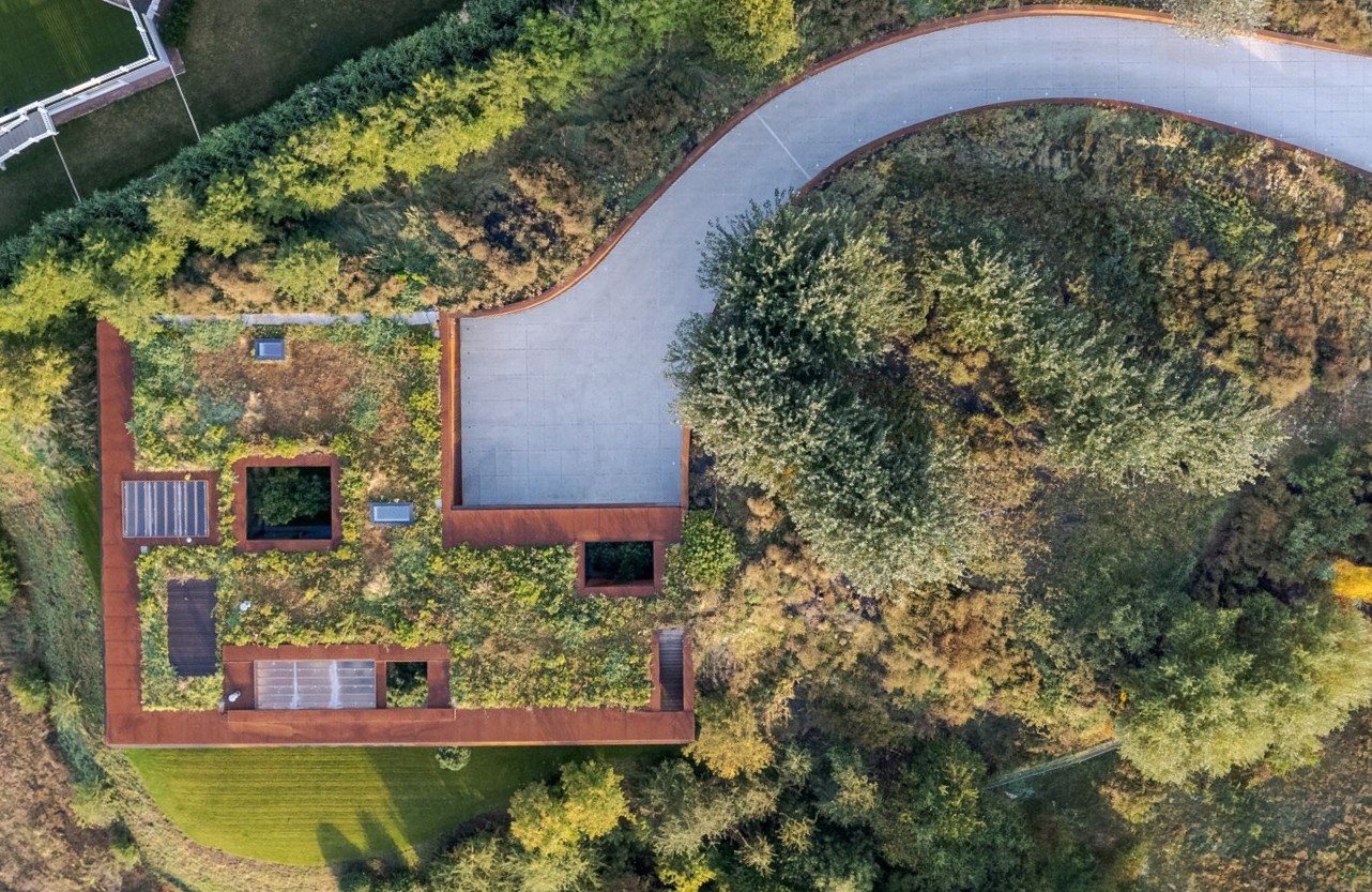 Doğayla uyum içinde tasarlanan binanın peyzaj odaklı planı, iç mekanları nehirle bütünleştiriyor. Corten çelik kaplama, yeşil çatı ve doğal bitki örtüsü, binayı çevreden neredeyse görünmez kılıyor.