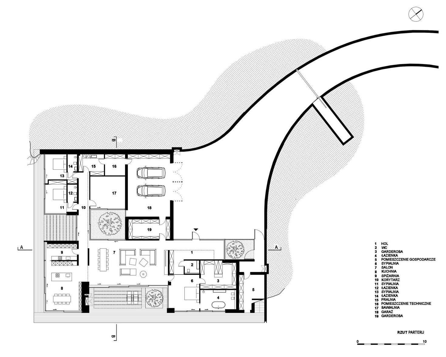 Corten çelik kaplı bir yolla ulaşılan avludan girilen ev, eşiği geçtiğinizde Vistül Nehri'nin muhteşem manzarasına açılıyor. Çatısı tamamen yeşil alanla kaplanmış, cephelerde ve giriş yolunda korten çeliği kullanılarak güçlü ama doğal bir görünüm elde edilmiştir. Çevredeki vahşi çalılar, çit işlevi görerek doğallığı korur.
